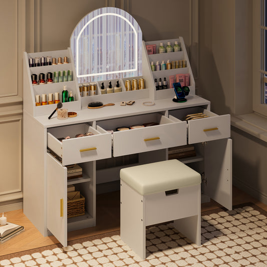47.2 Makeup Vanity With Mirror And Light, Vanity Desk With Cushioned Storage Stool, Dressing Table With Two Organizers,3 Drawers And 2 Cabinets For Bedroom, White