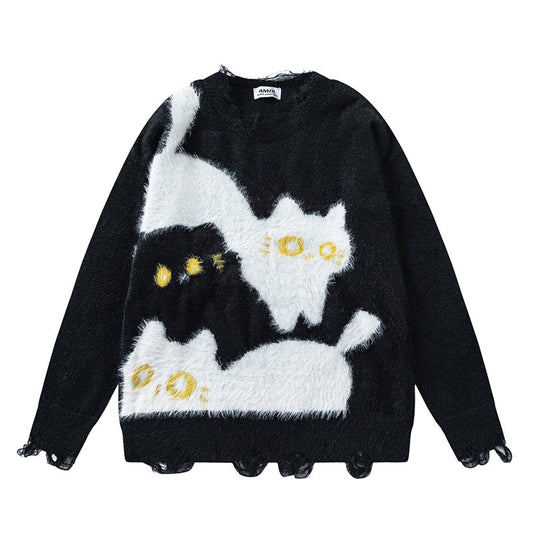 American Retro Plush Cat Ripped Tassel Design Sweater
