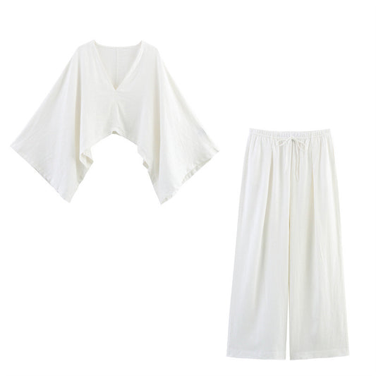 Asymmetric Linen Top Wide Leg Pants Two-piece Suit