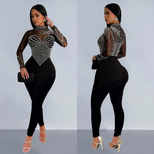 Fashion Pure Color Mesh Rhinestone Long-sleeved Trousers Jumpsuit