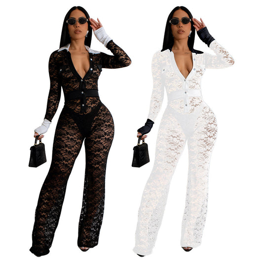 Autumn Lace Mesh Tight Design Retro Affordable Luxury Temperament Top Jumpsuit