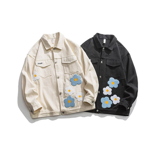 Flower Embroidered Pocket Work Jacket Retro Loose Lapel Jacket Men's