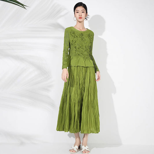 Solid Color Embroidered Long-sleeved Top Handmade Pleated Two-piece Overskirt Suit