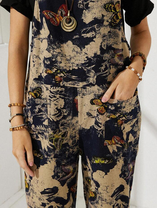 Vintage Butterfly Print Button Pocket Jumpsuit