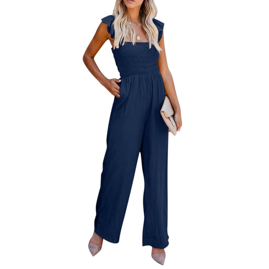 Women's Casual Ruffled Shoulder Straps High Waist Solid Color Wide Leg Jumpsuit