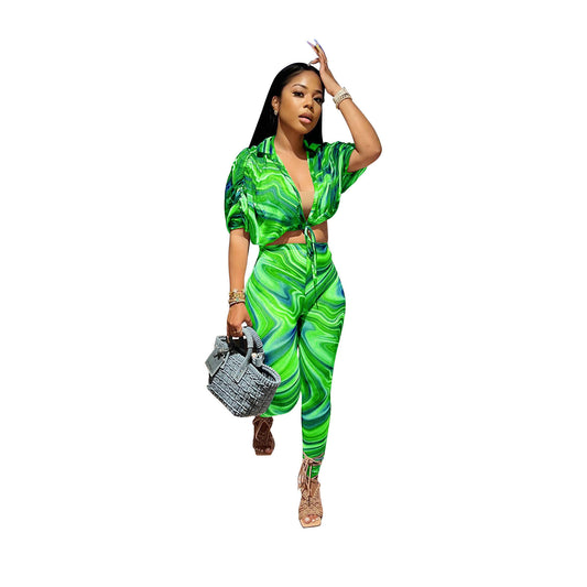 Lapel Tied Tight Waist Corrugated Printed Tapered Trousers Short Sleeve Shirt Casual Suit