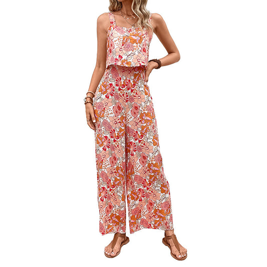 Women's Fashionable Digital Printing Suspender Wide-leg Trousers Suit