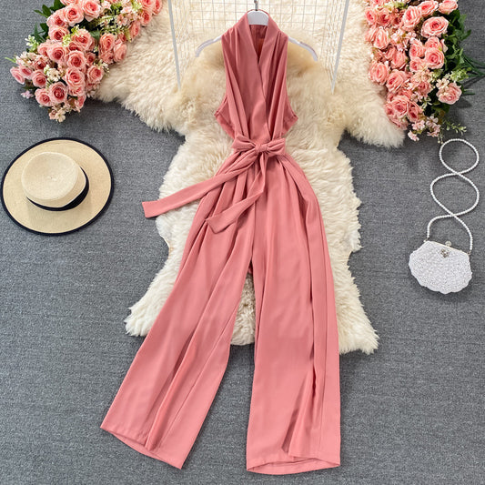 Student Korean Casual V-neck Slim Jumpsuit Wide-leg Pants Suit