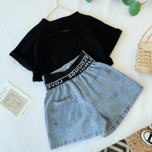 Little Girl Korean Fashion Medium And Large Children's Denim Shorts Two-piece Set
