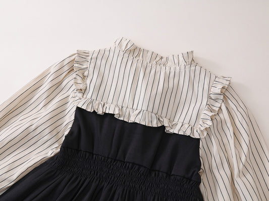 Fake Two-piece Korean Striped Contrast Color Long Sleeve Skirt
