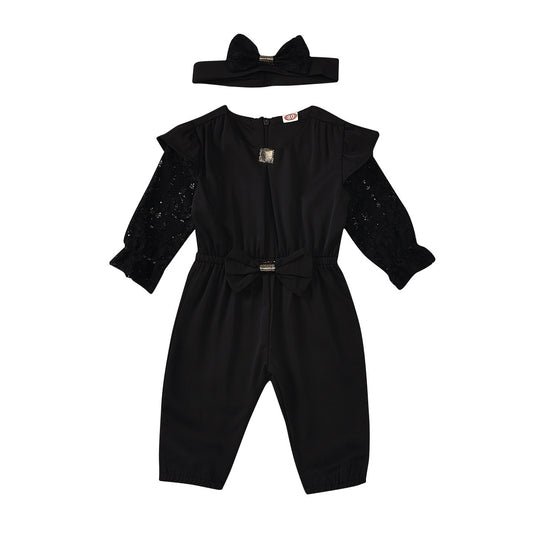 Round Neck Solid Color Zipper Girls Summer Long Sleeve Jumpsuit Headband Two Set