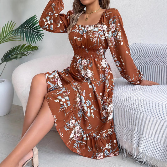 Elegant Flowers Square Collar Long Sleeve Waist Trimming Ruffles A- Line Skirt