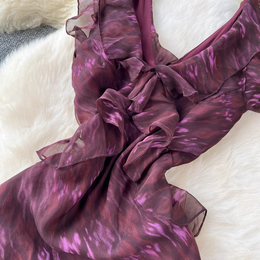 Design Sense V-neck Flounce Halter Lace-up Waist Trimming Printing Chiffon Dress