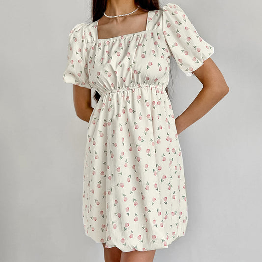 French Elegant Floral Puff Sleeve Dress