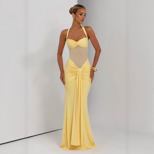 Women's Hollow-out Halter Sling High Waist Slimming Printed Pleated Dress