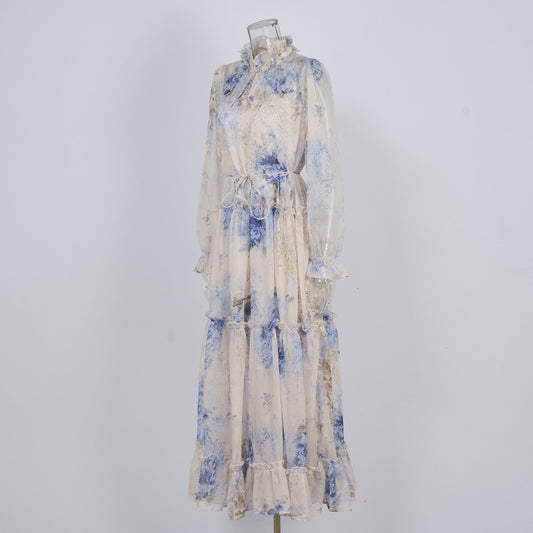 Elegant Idle Style Printed Square Collar Loose Long Puff Sleeve Dress