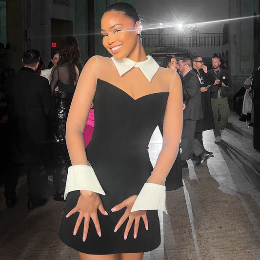 Sexy Deep V Hollow-out Long Sleeve Pleated Waist-tight Hip-wrapped Skirt Dress