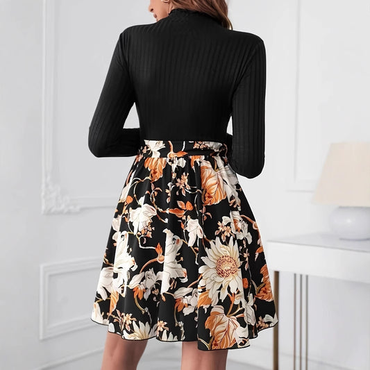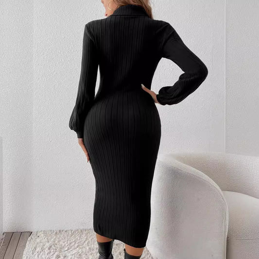 Women's Casual Fashion Solid Color Rib Fabric Turtleneck Long Sleeve Dress