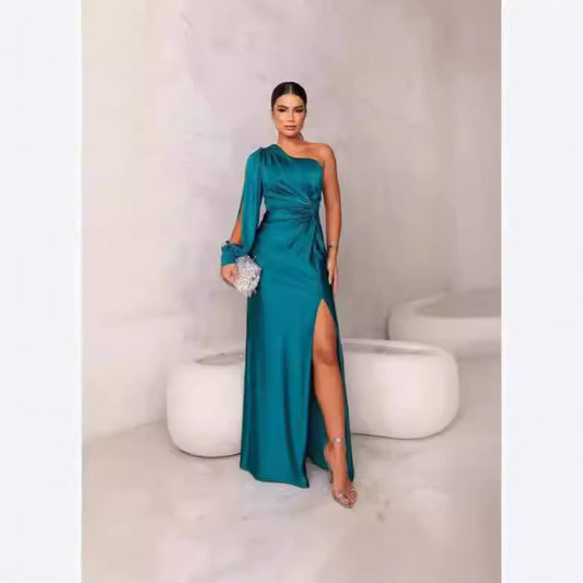 Women's Diagonal Collar Raglan Sleeve Pleated Waist Tight Split Sexy Long Dress