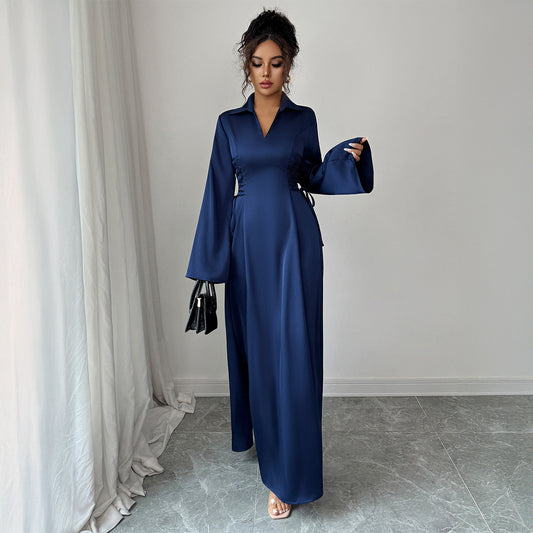 Elegant Graceful Style Waist Solid Color Long Sleeve Dress