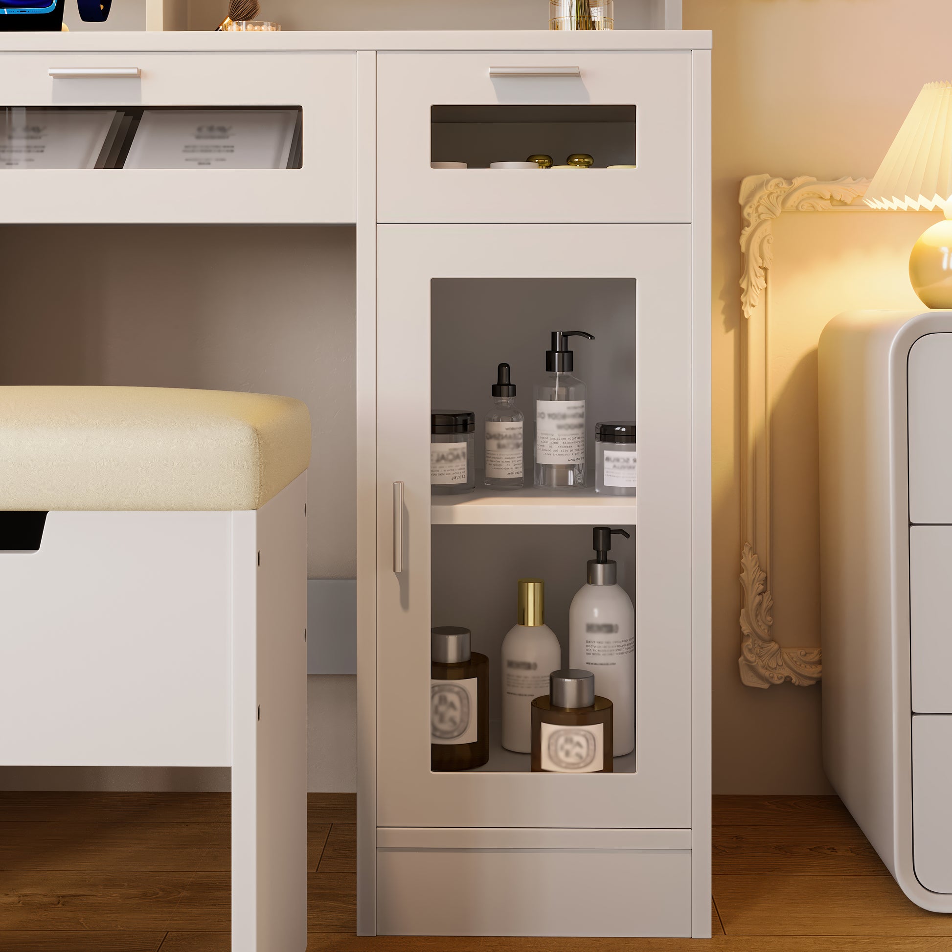 - Charming Makeup vanity: Crafted from premium MDF in a sleek white finish, this vanity unit combines durability with a clean, modern look. The doors and drawers are finished with tempered glass panels, adding an elegant touch while ensuring that storage space is visible.