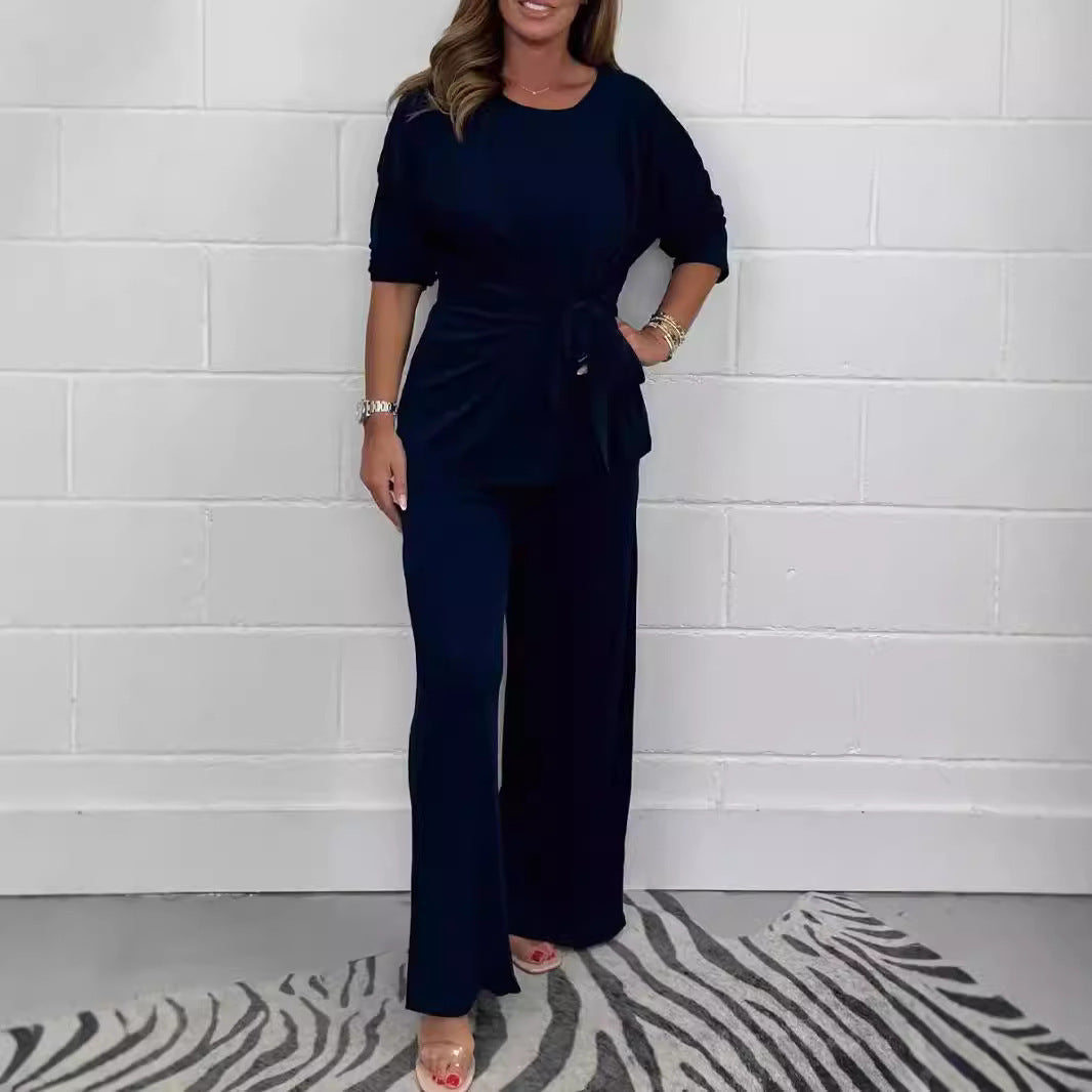 Amazon Europe And America Cross Border 2024 Fall Women's Clothing Solid Color Casual Fashion Lace-up Long Sleeve Top And Trousers Suit