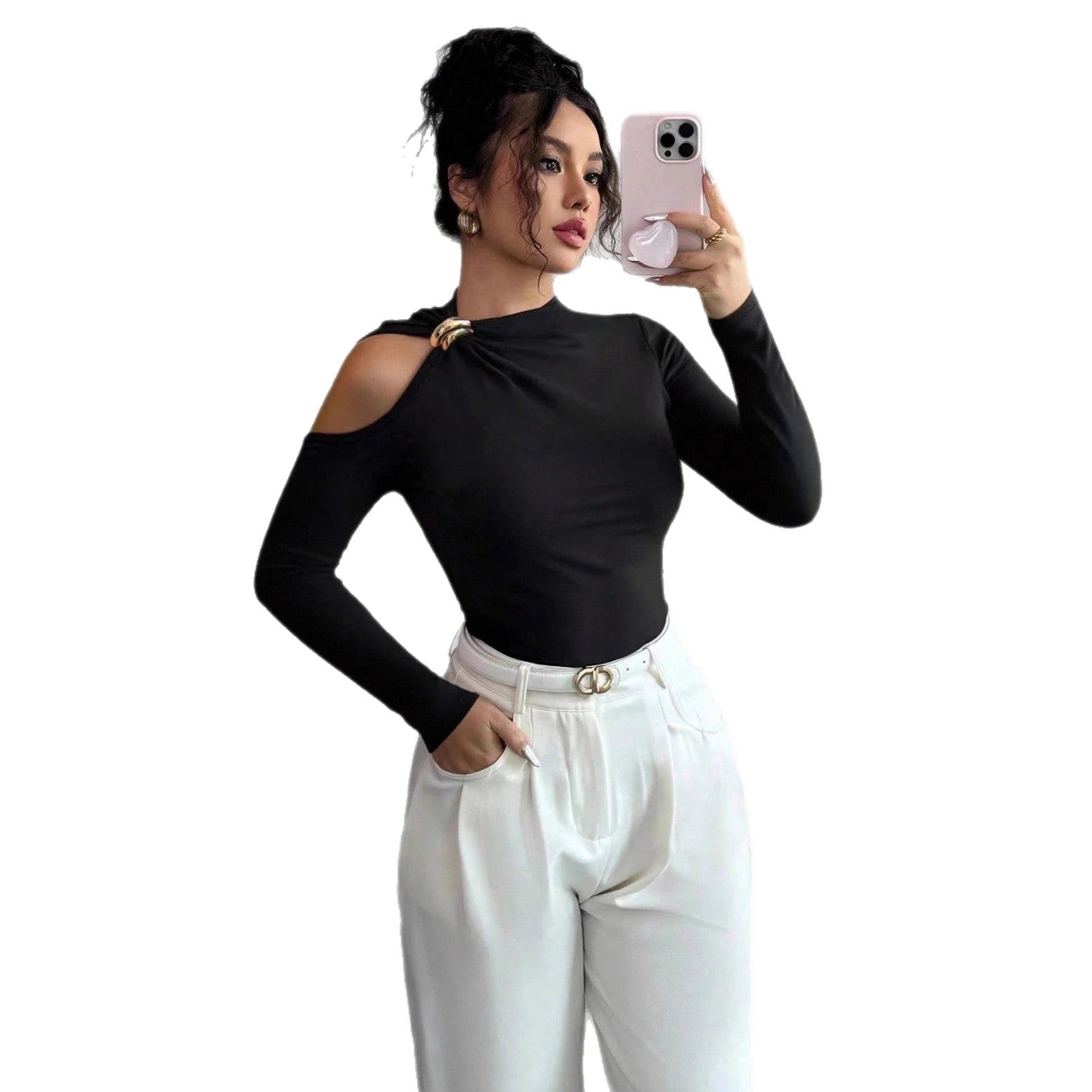 Asymmetric Collar One-side Off-the-shoulder Metal Decorative Slim Top