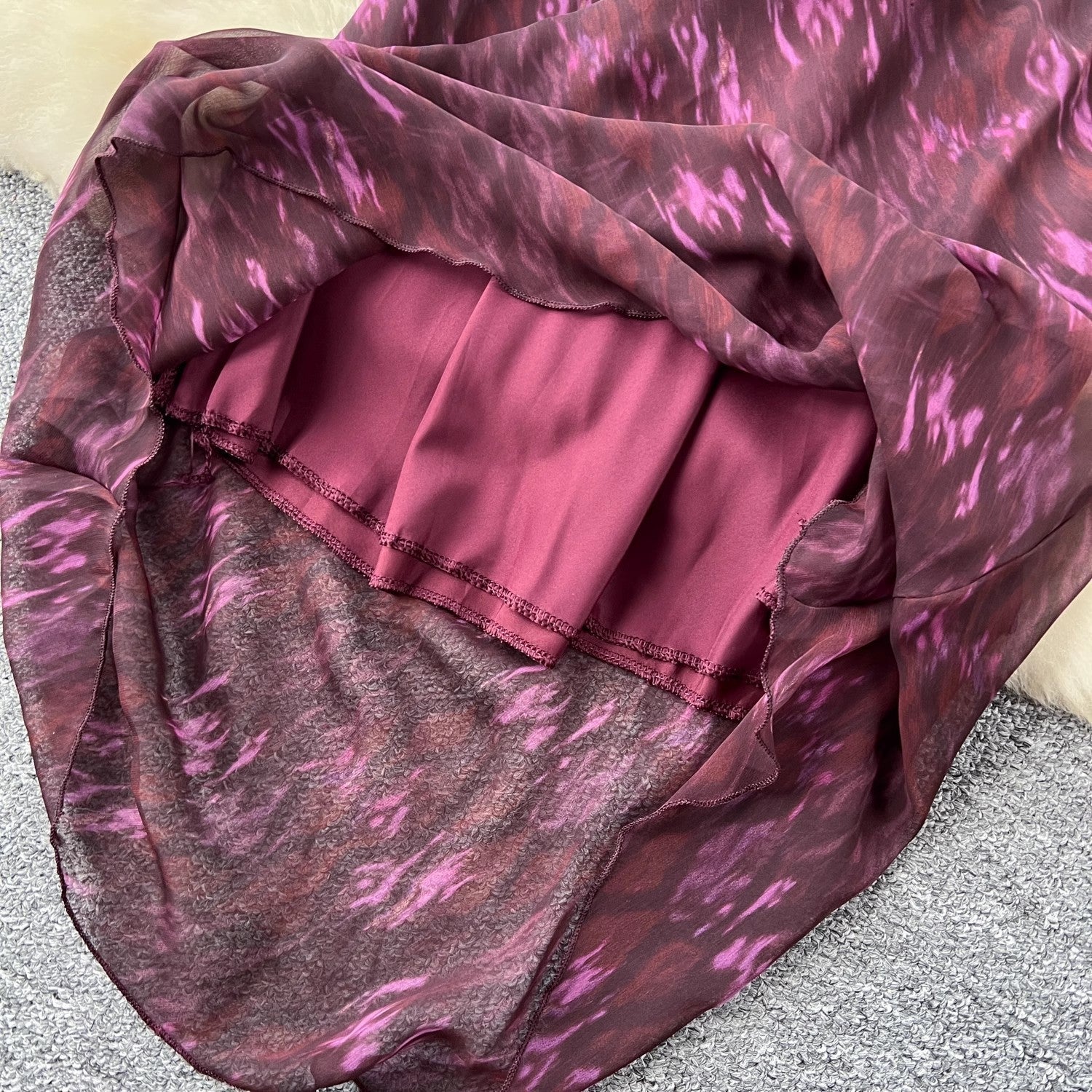Design Sense V-neck Flounce Halter Lace-up Waist Trimming Printing Chiffon Dress