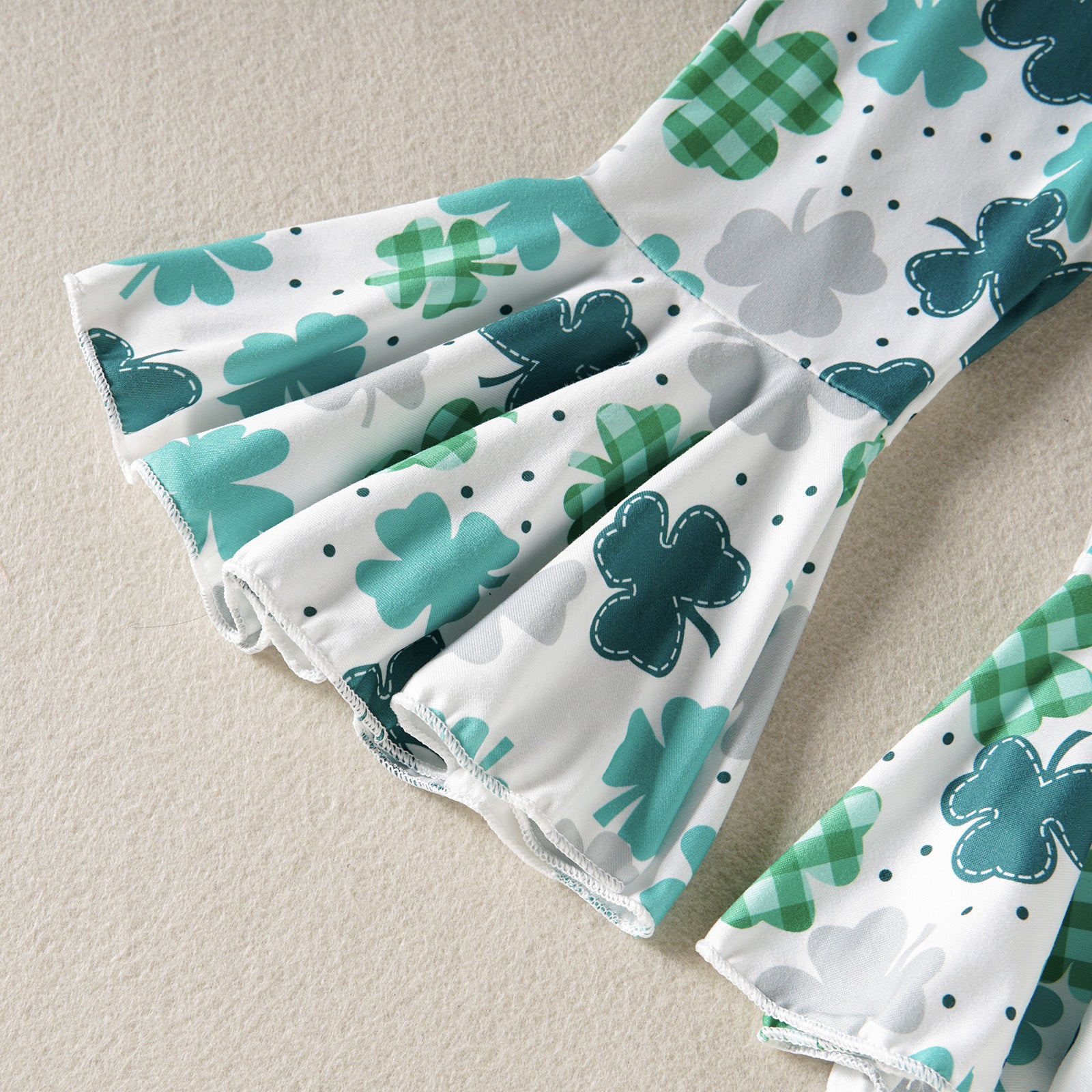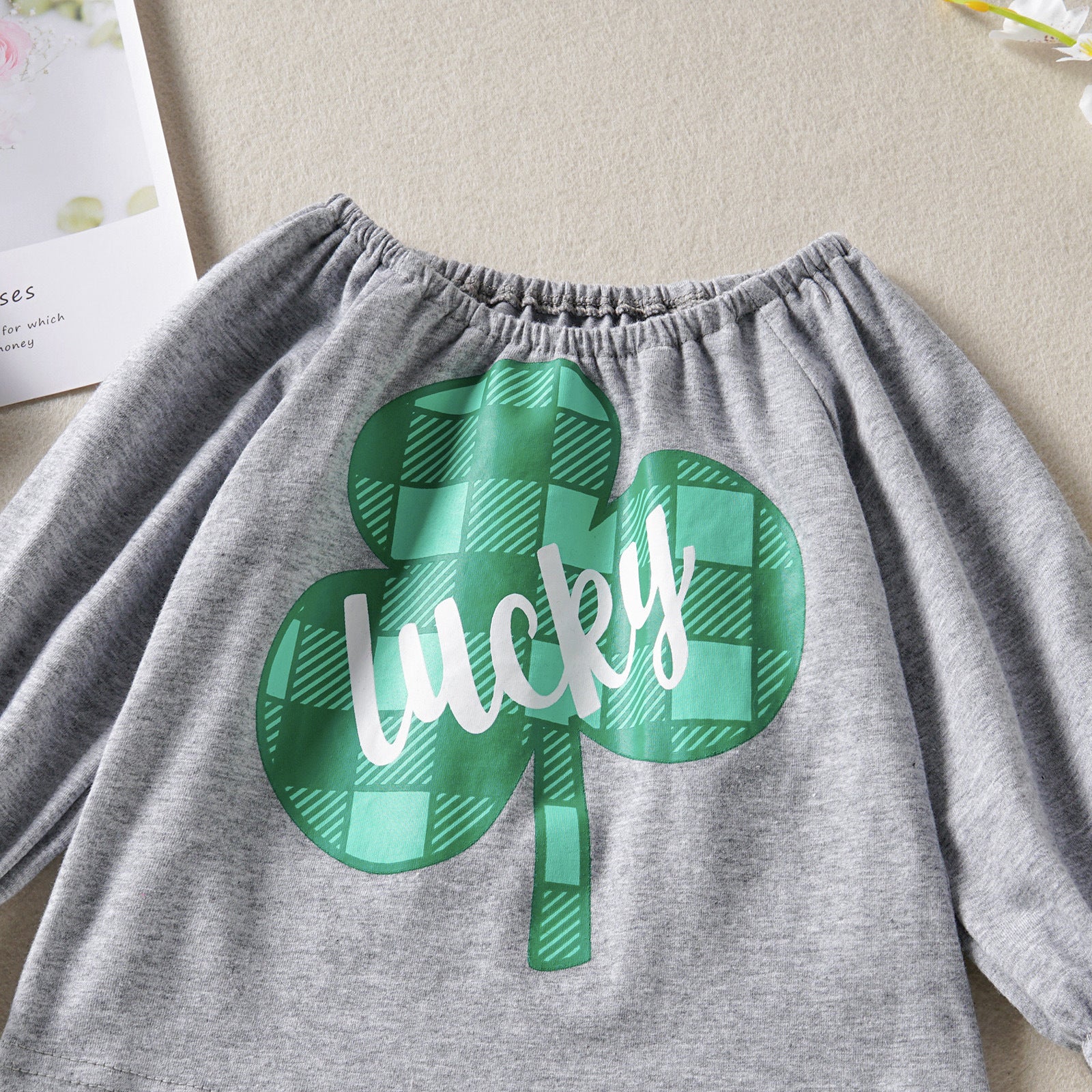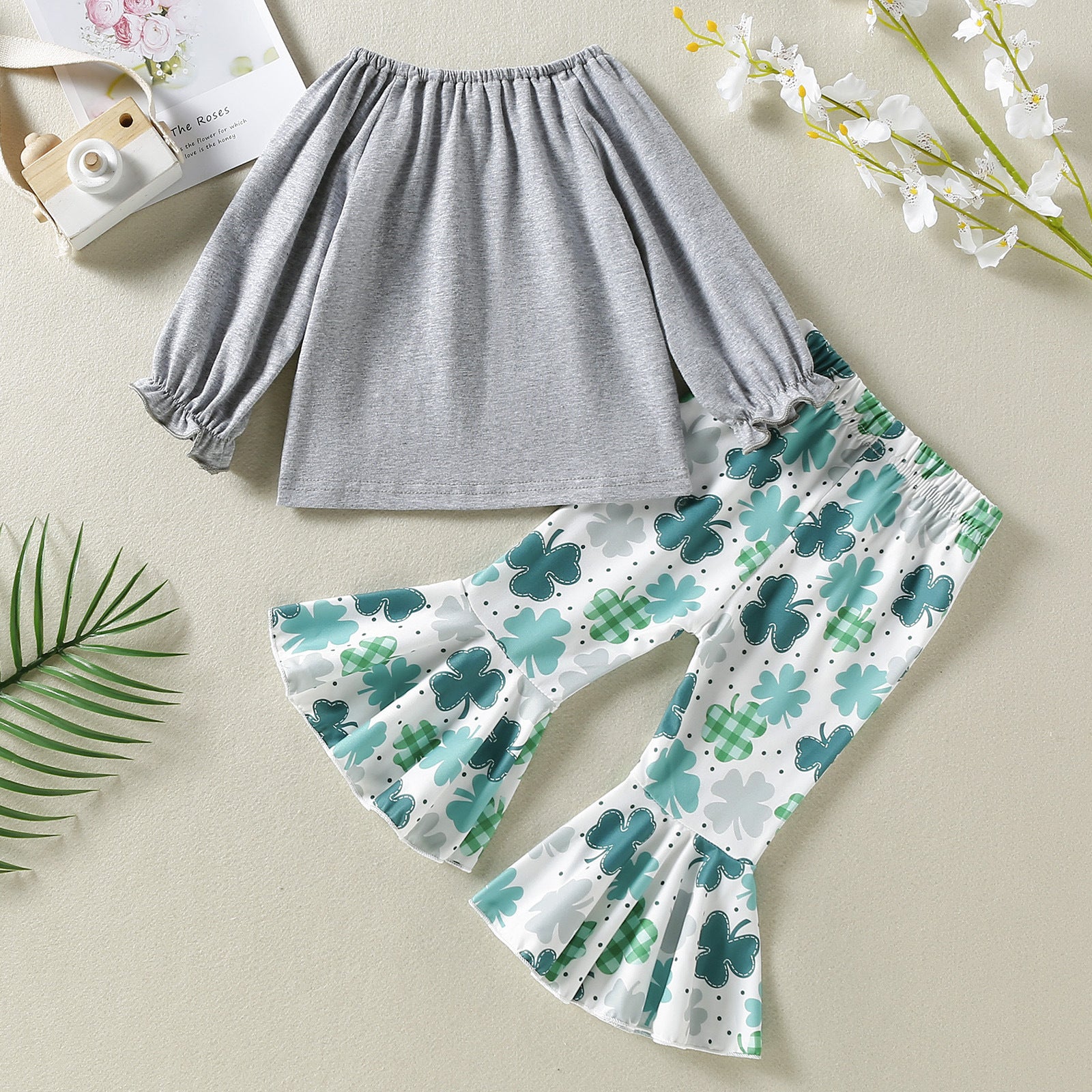Four-Leaf Clover Printed Gray Long Sleeve Top White Trousers Two-piece Set