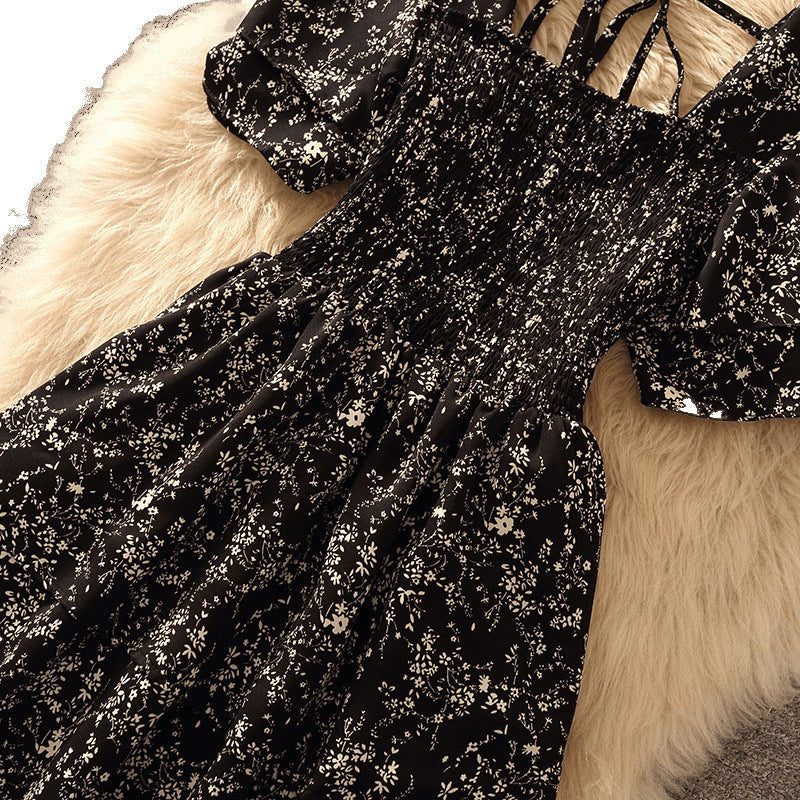 French Square Collar Floral Dress Waist Slimming Women