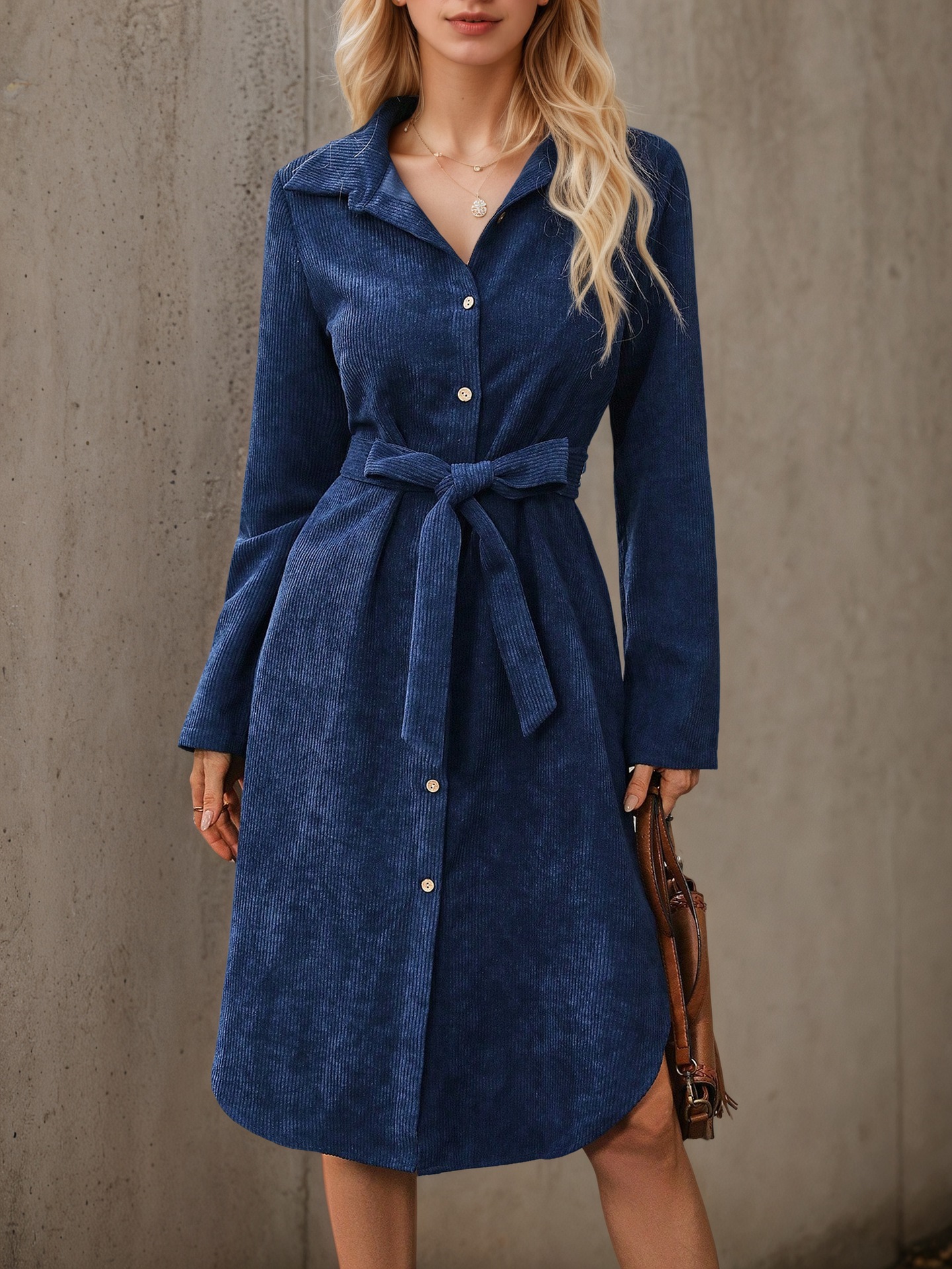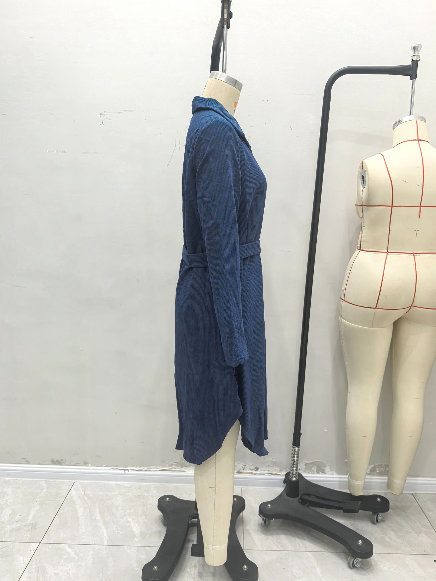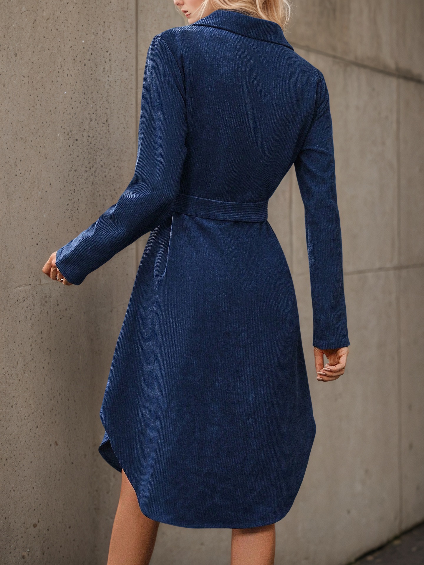 Front Button Belted Irregular Long Sleeve Corduroy Dress