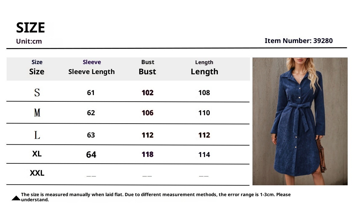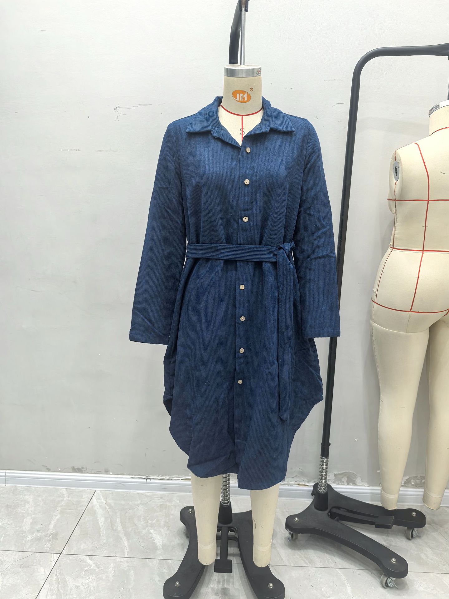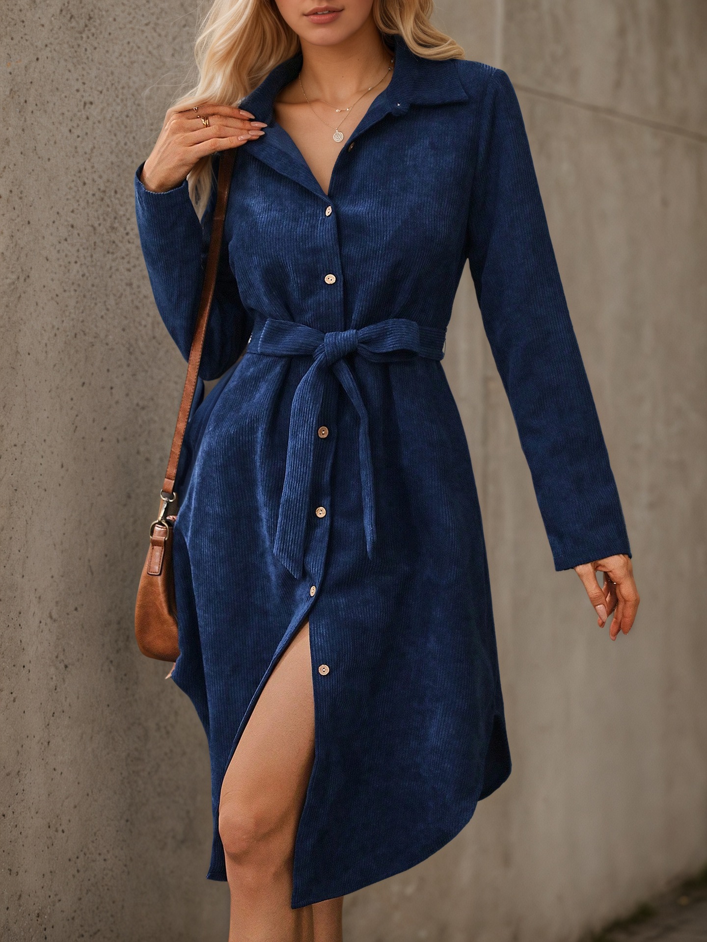 Front Button Belted Irregular Long Sleeve Corduroy Dress