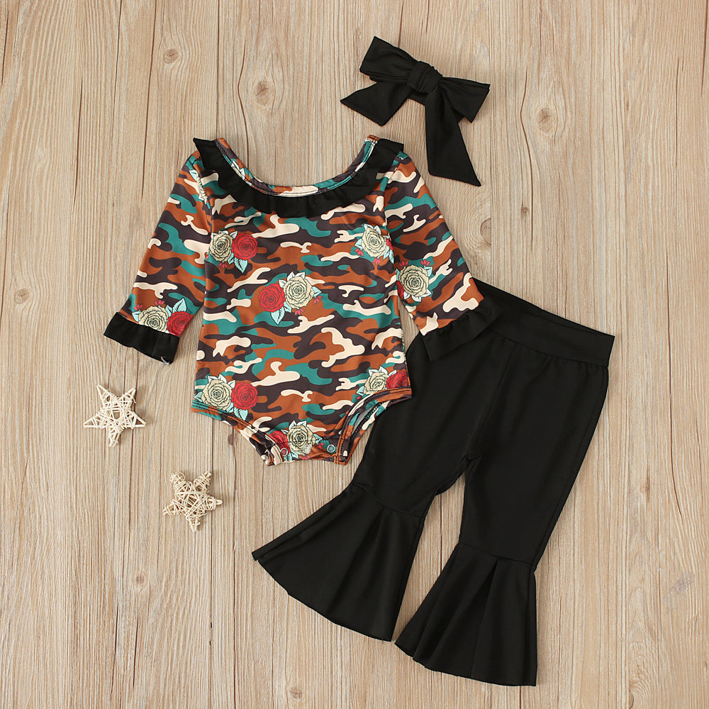 Girls Camouflage Long Sleeve Romper Black Flared Trousers Headband Set