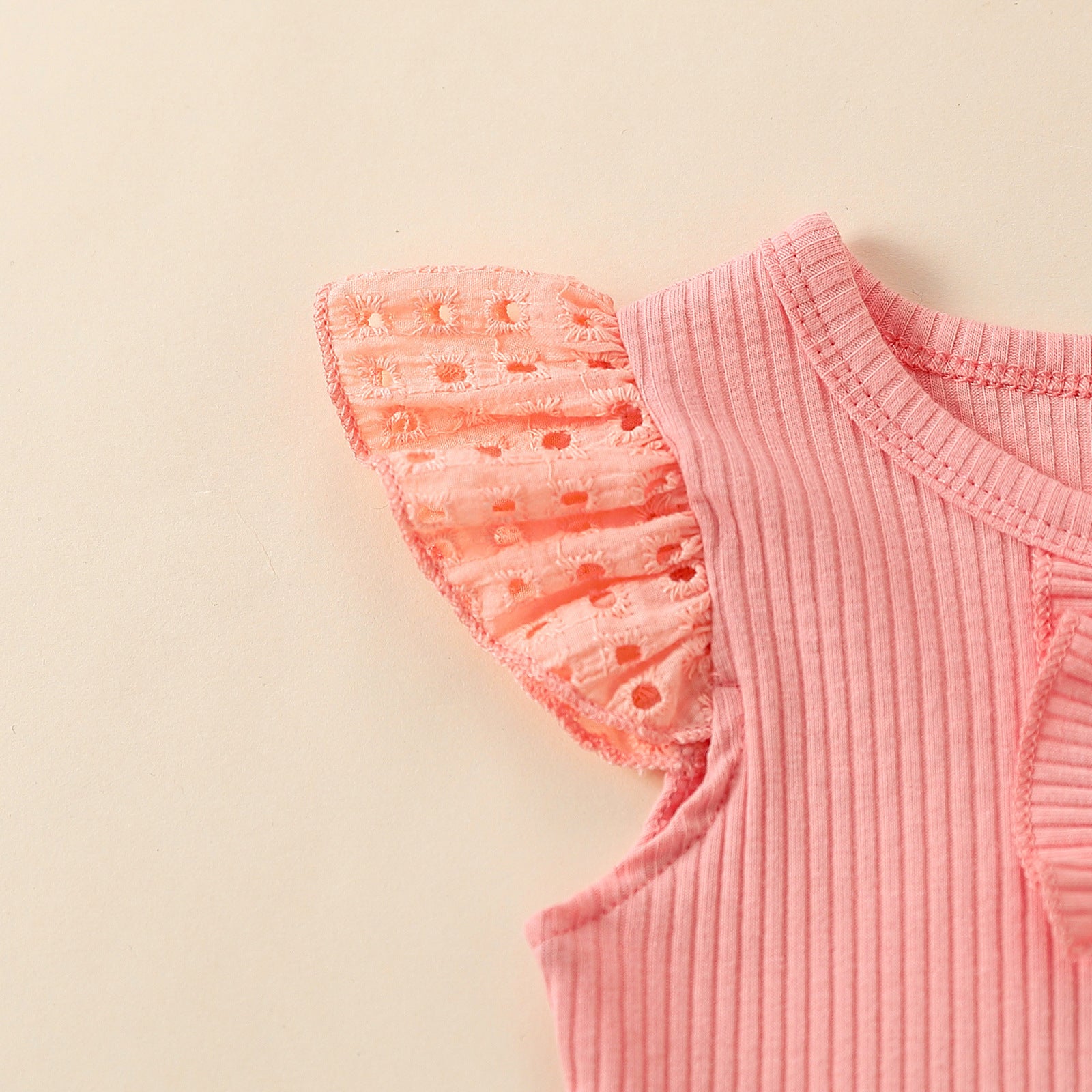 Girls' Flounced Sleeve Buttons Sunken Stripe Cotton Shorts Suit