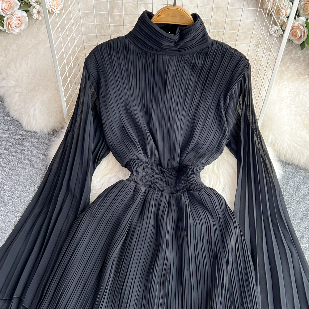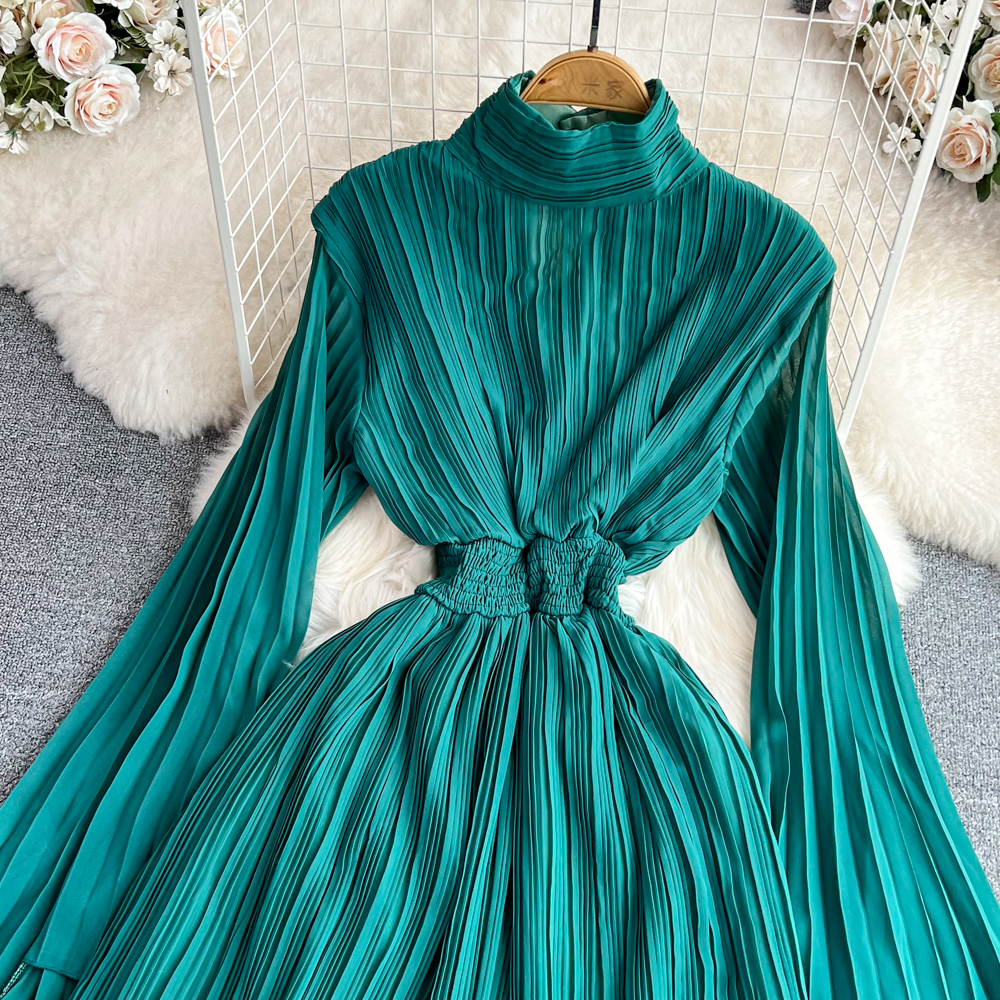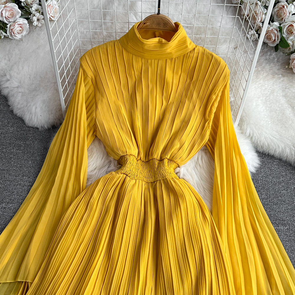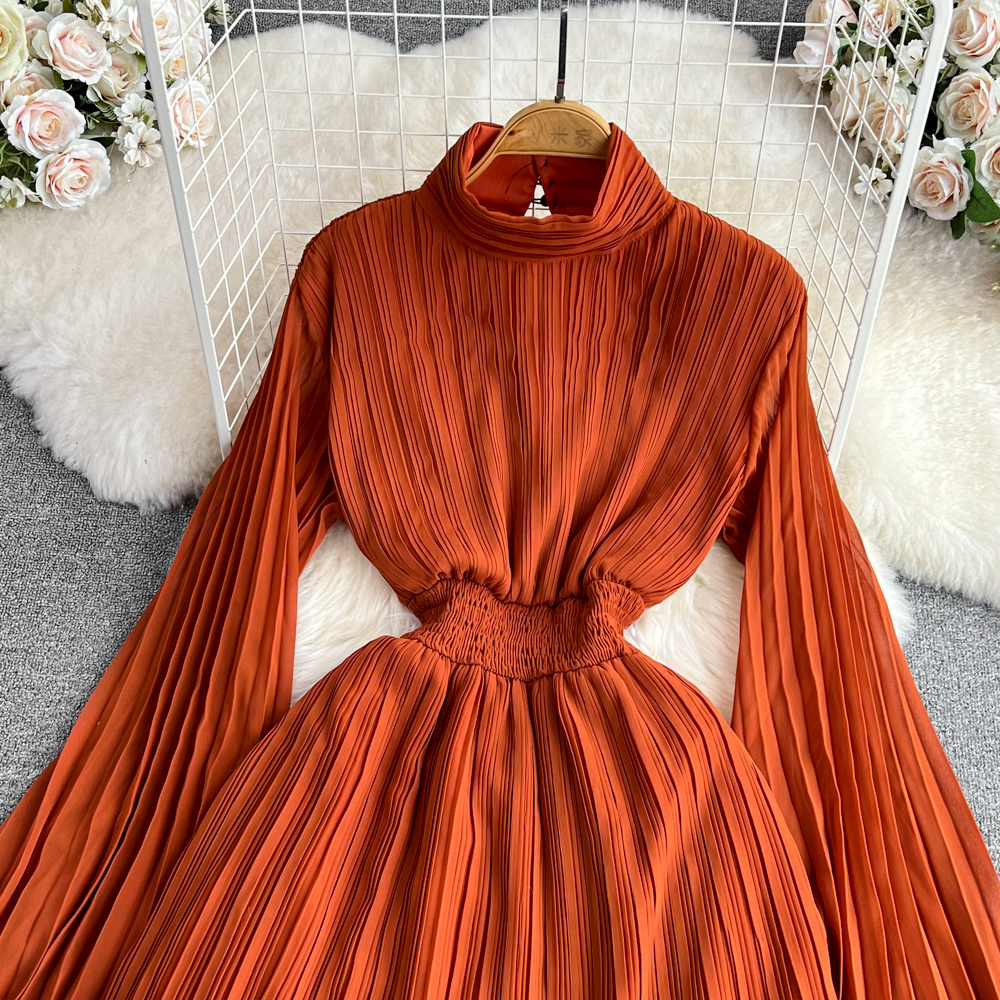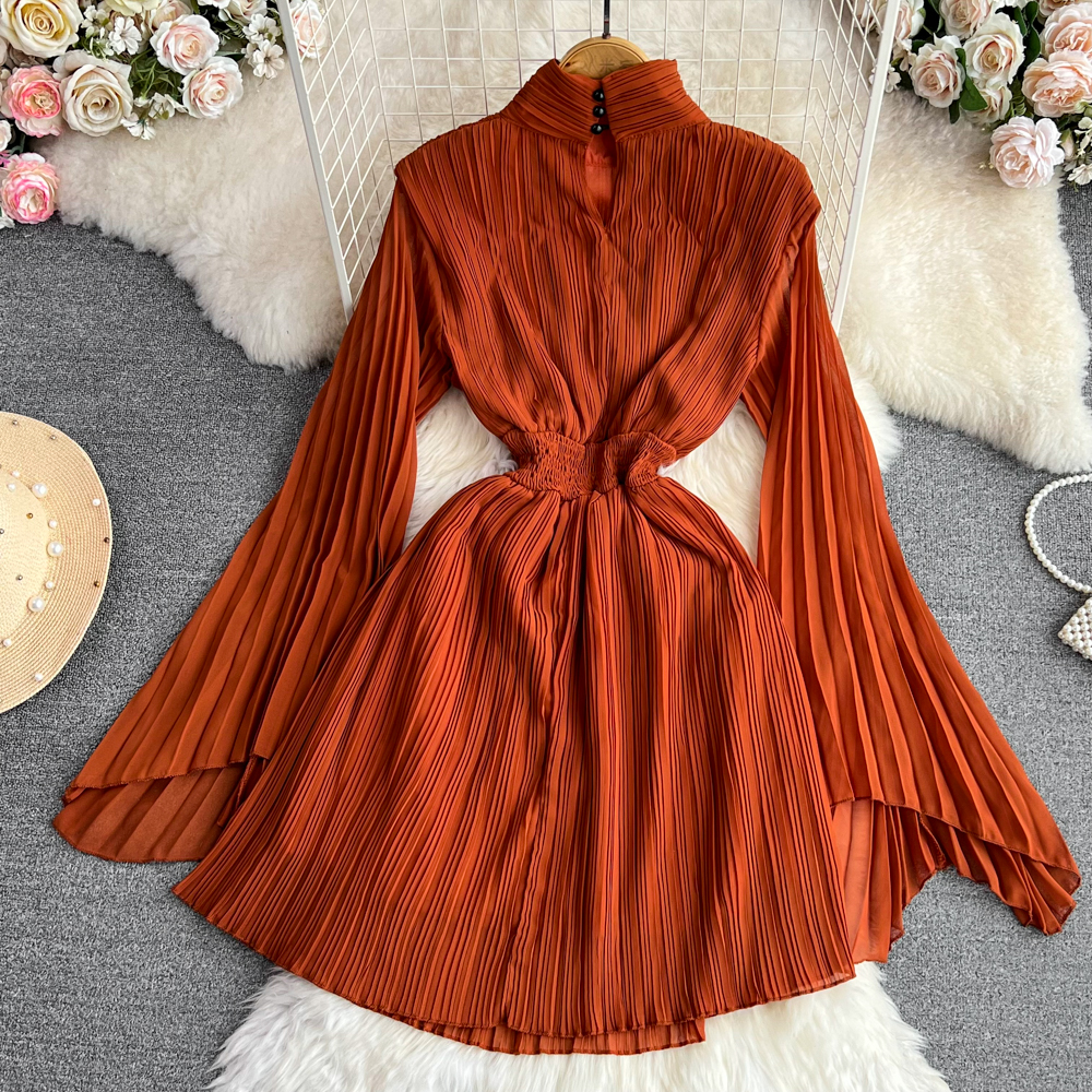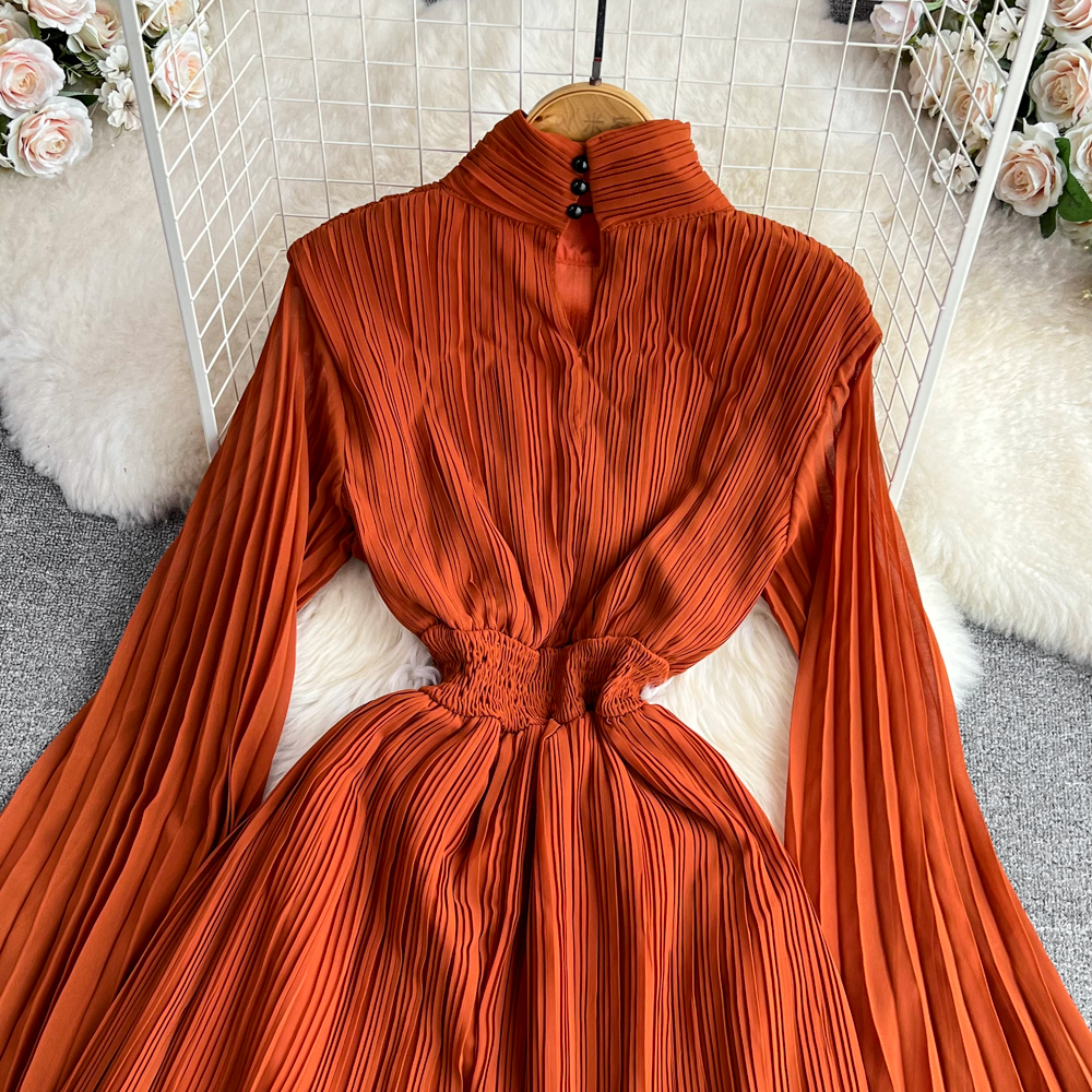 Horn Long Sleeves Stand Collar Waist A-line Chiffon Dress