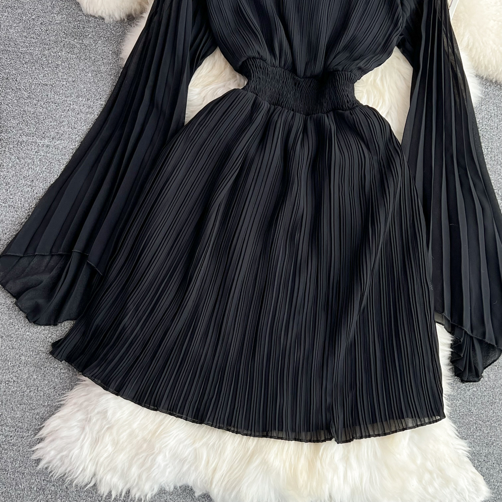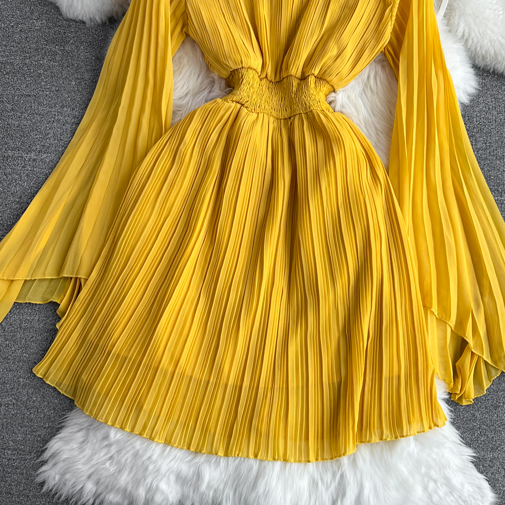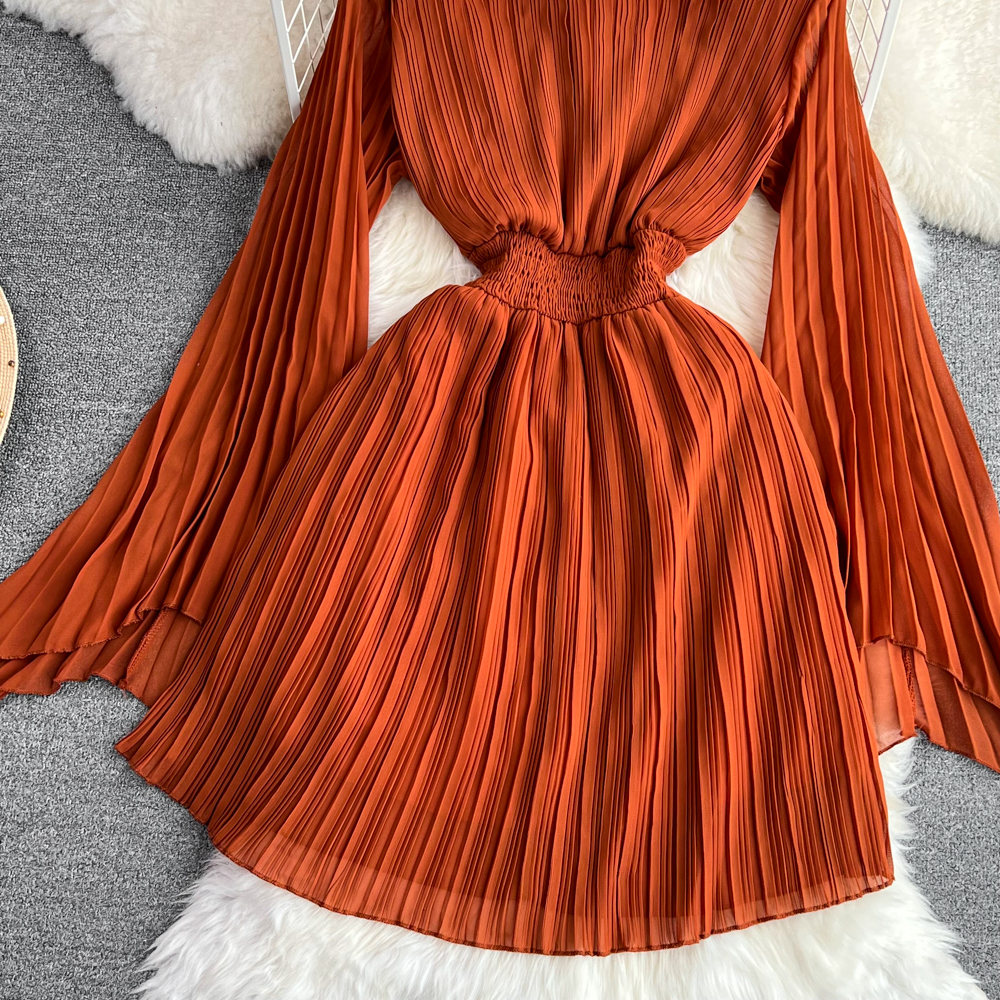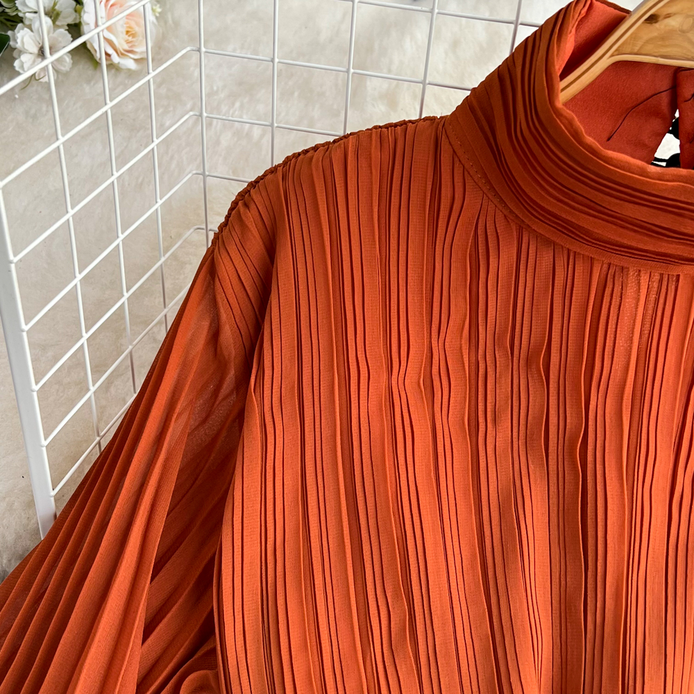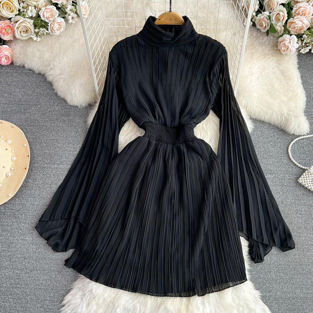 Horn Long Sleeves Stand Collar Waist A-line Chiffon Dress