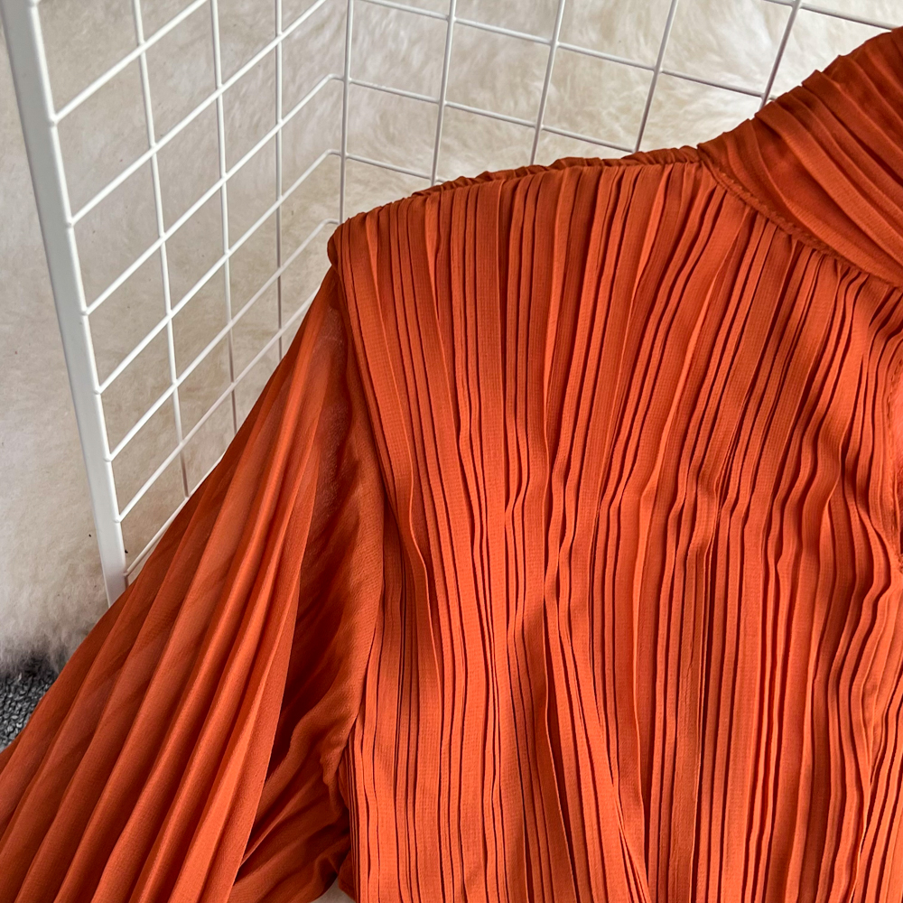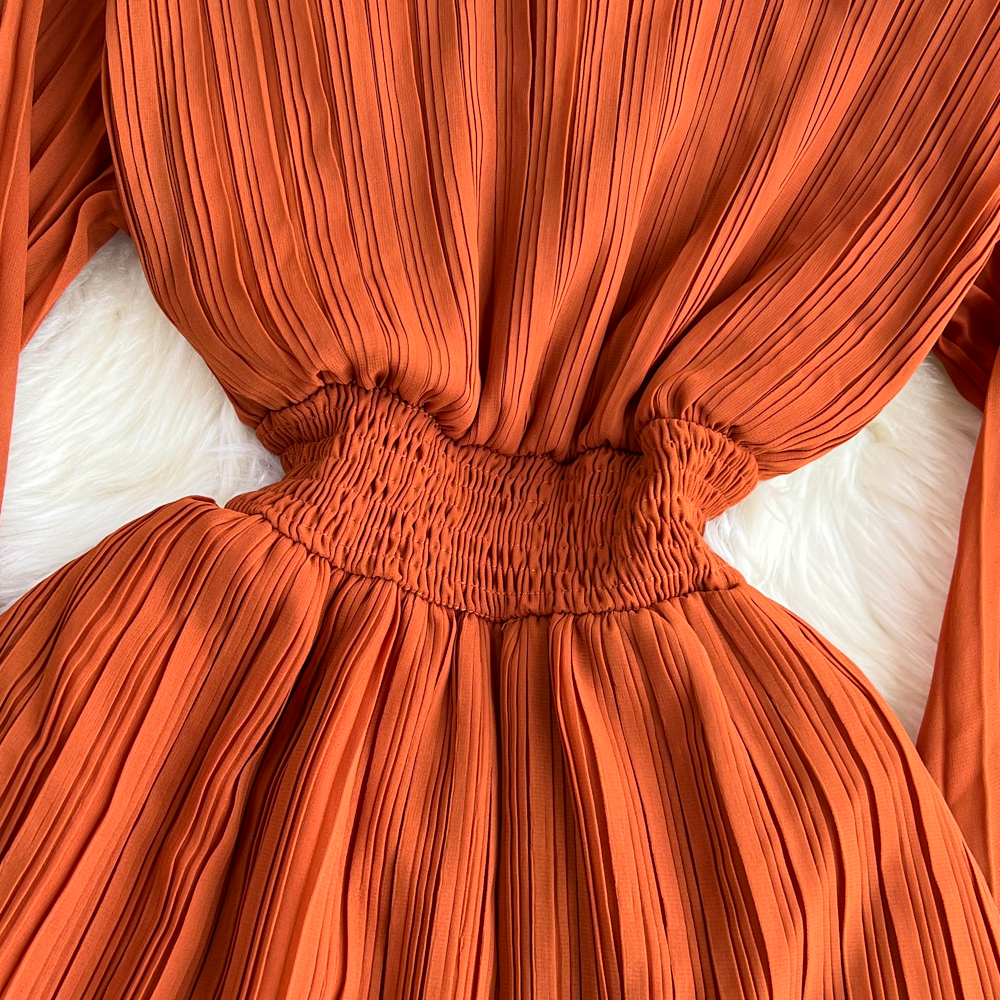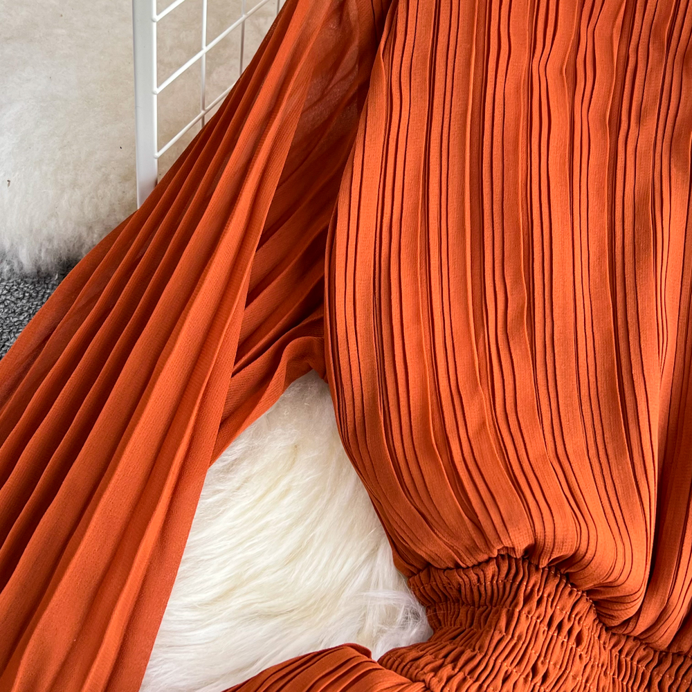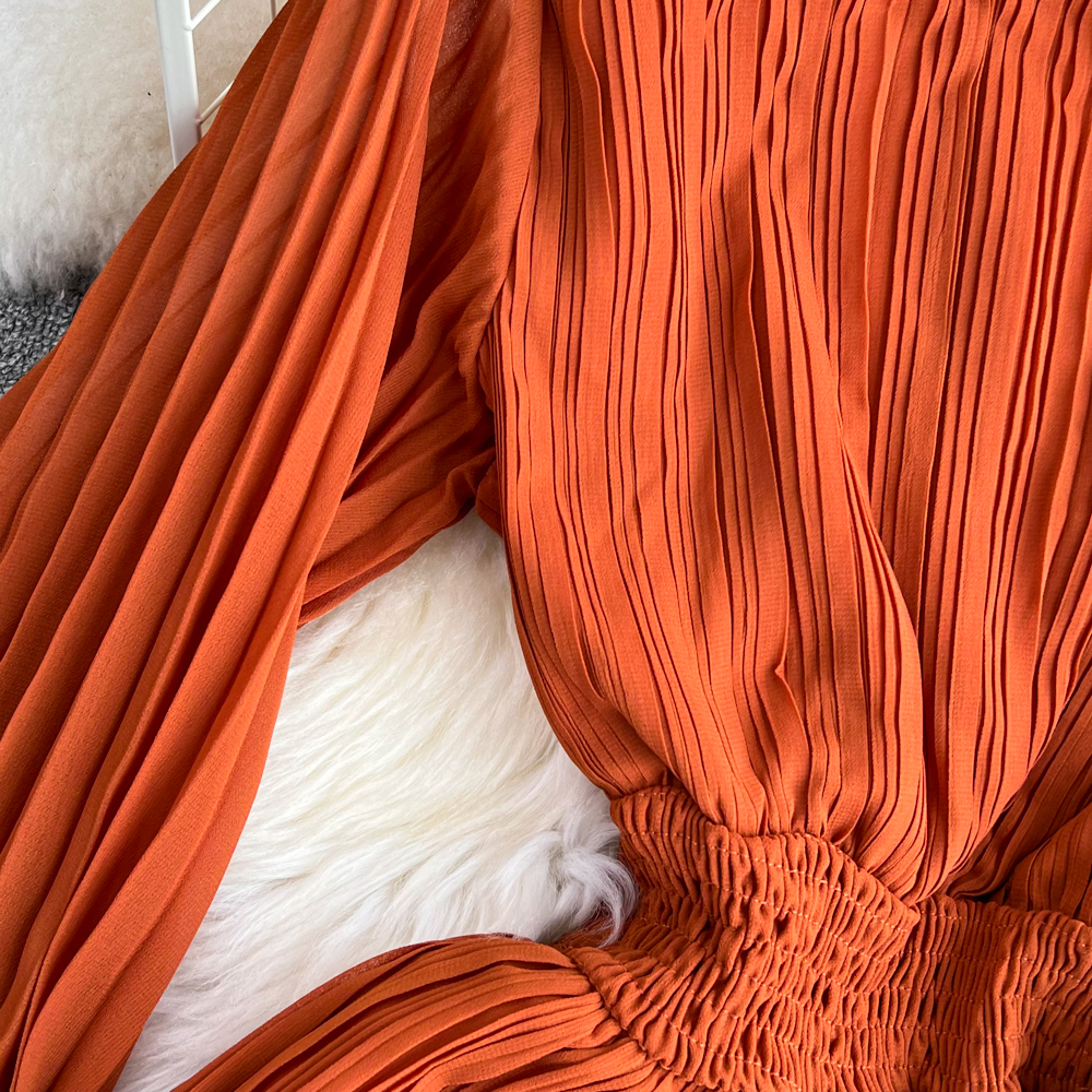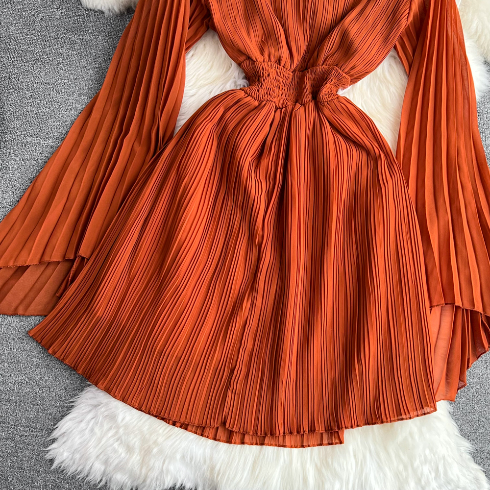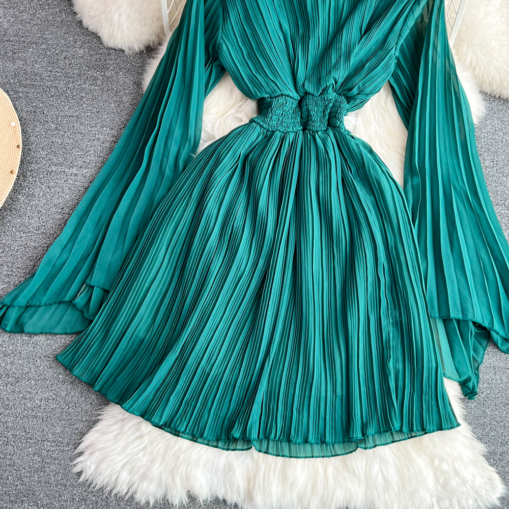 Horn Long Sleeves Stand Collar Waist A-line Chiffon Dress