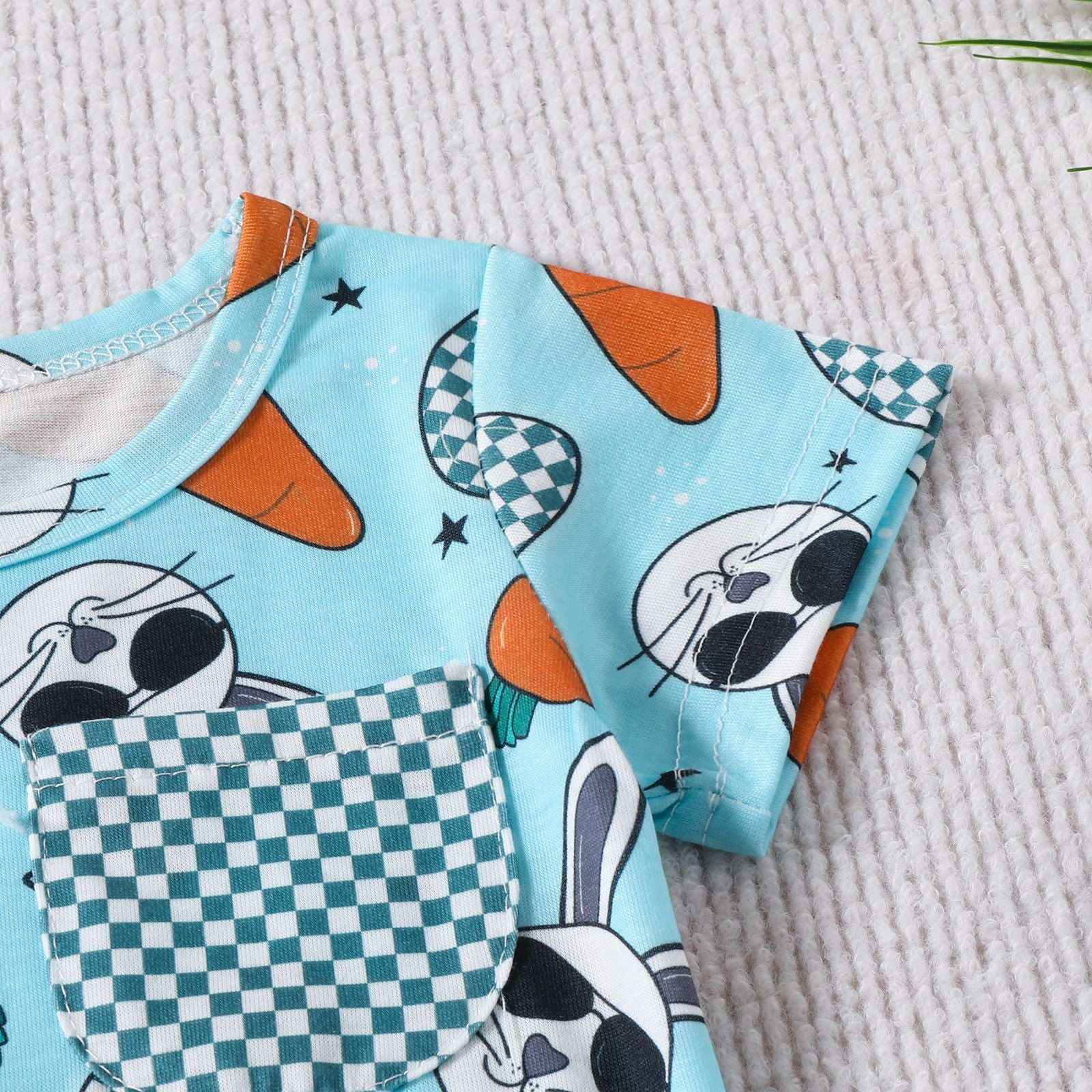 Rabbit Carrot Printed Plaid Pocket Short Sleeve