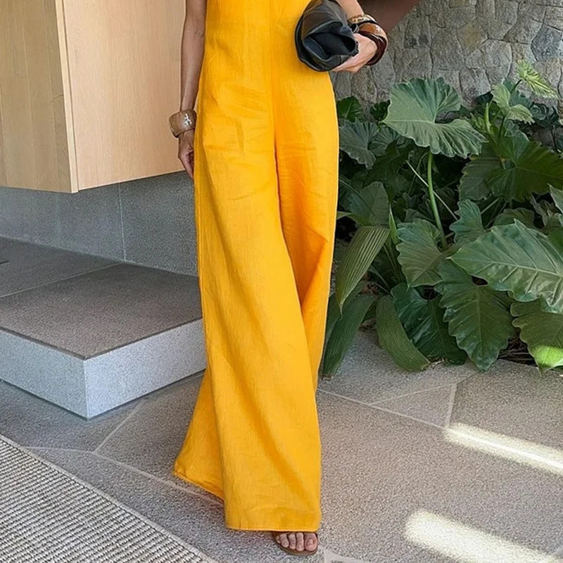Solid Color And V-neck Sleeveless Simple Style Wide Leg One-piece Trousers