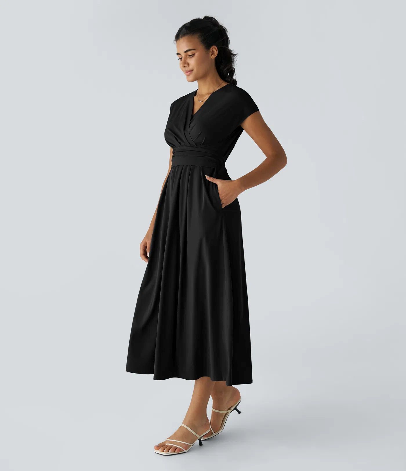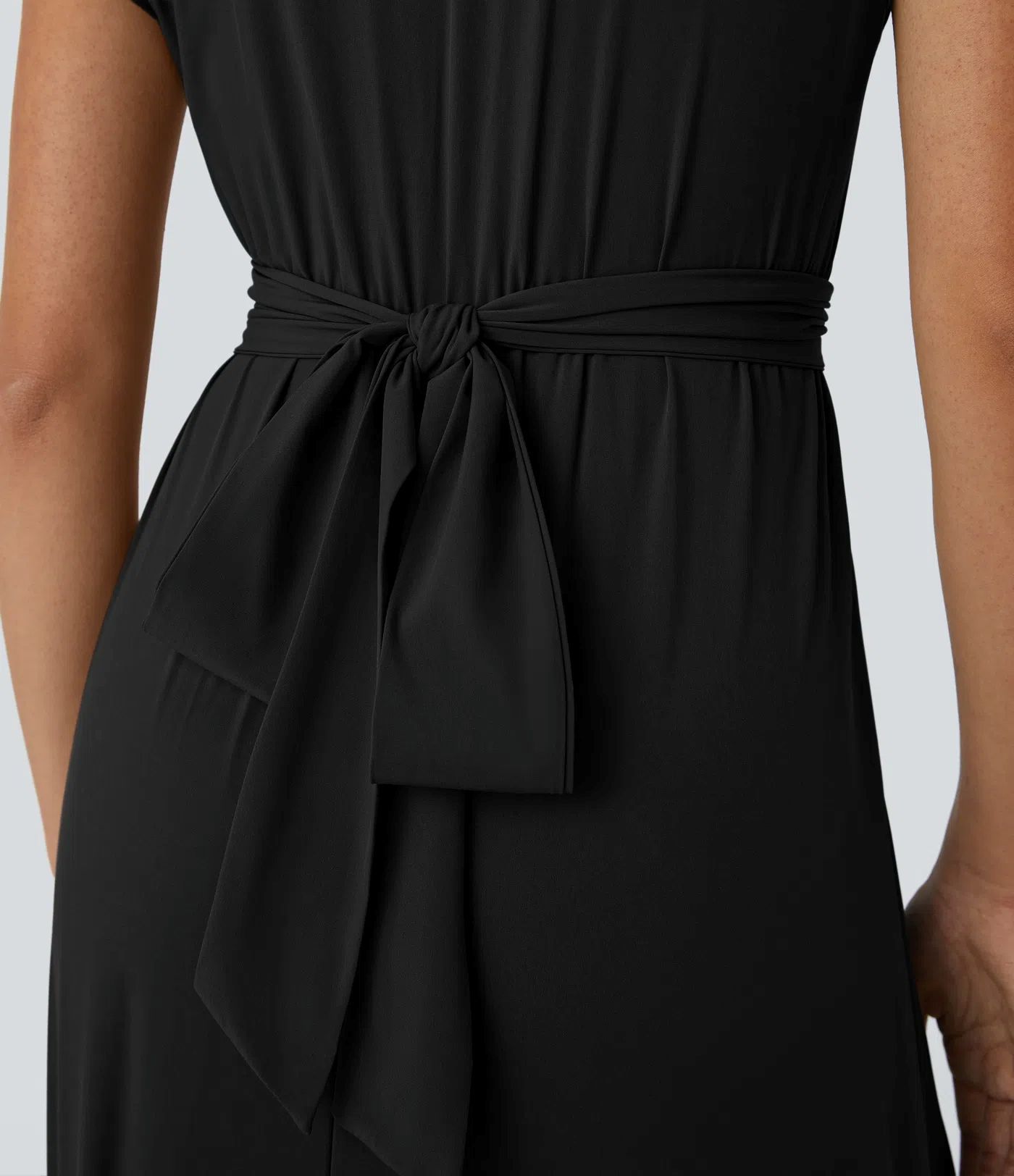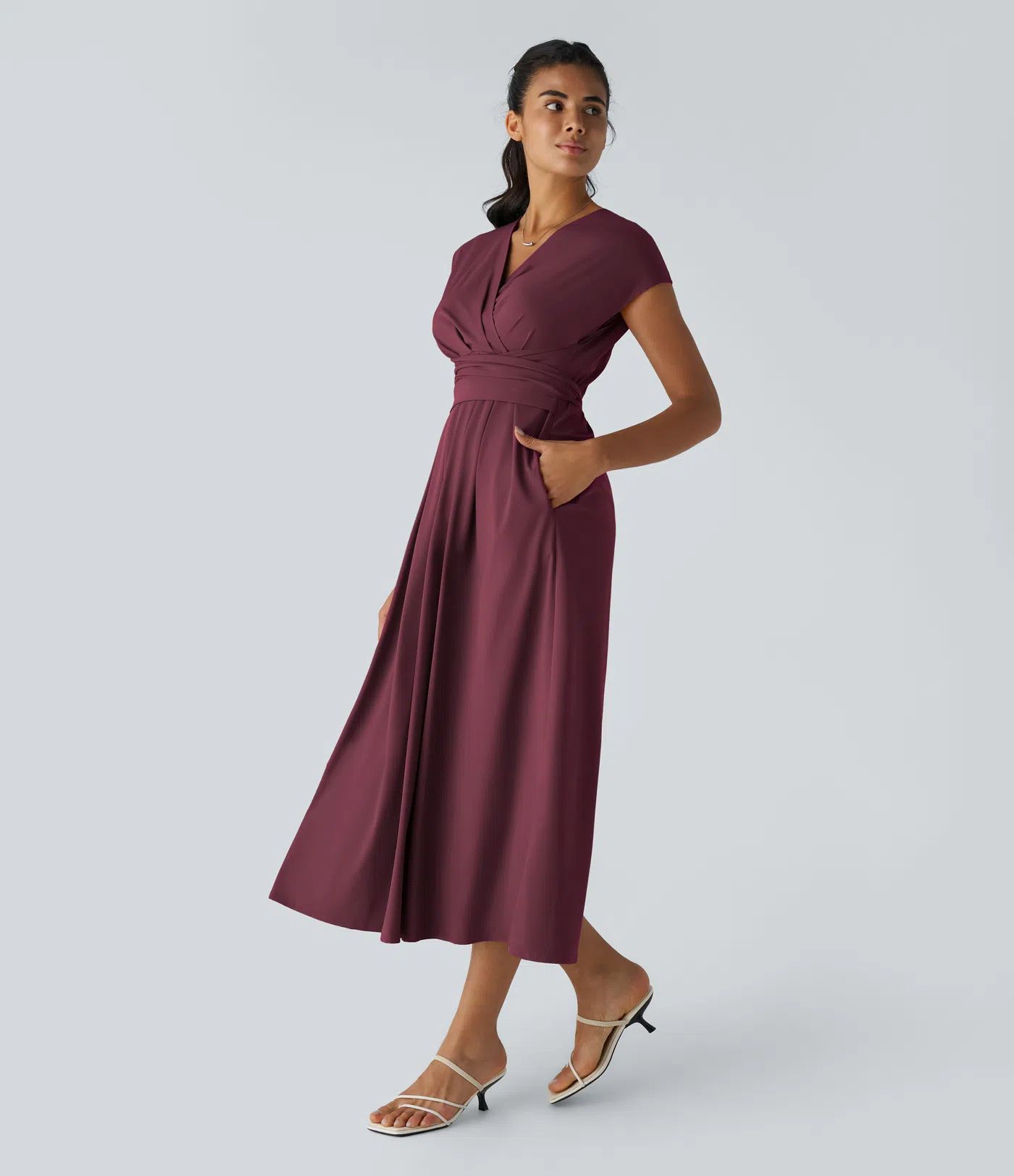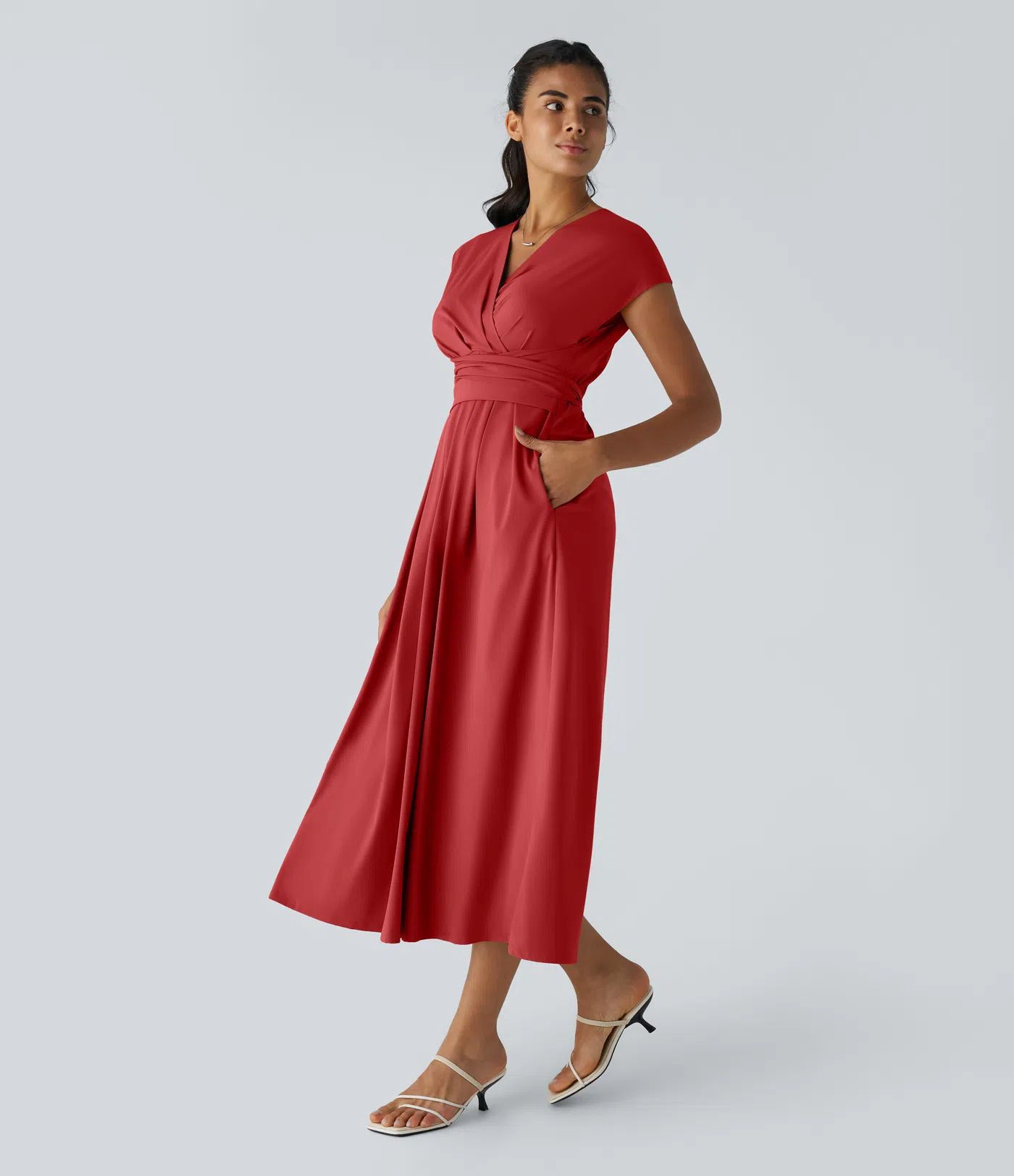 Solid Color Overlapping V-neck Short Sleeve Side Pocket Lace-up Quick-drying Mid-length Casual Dress