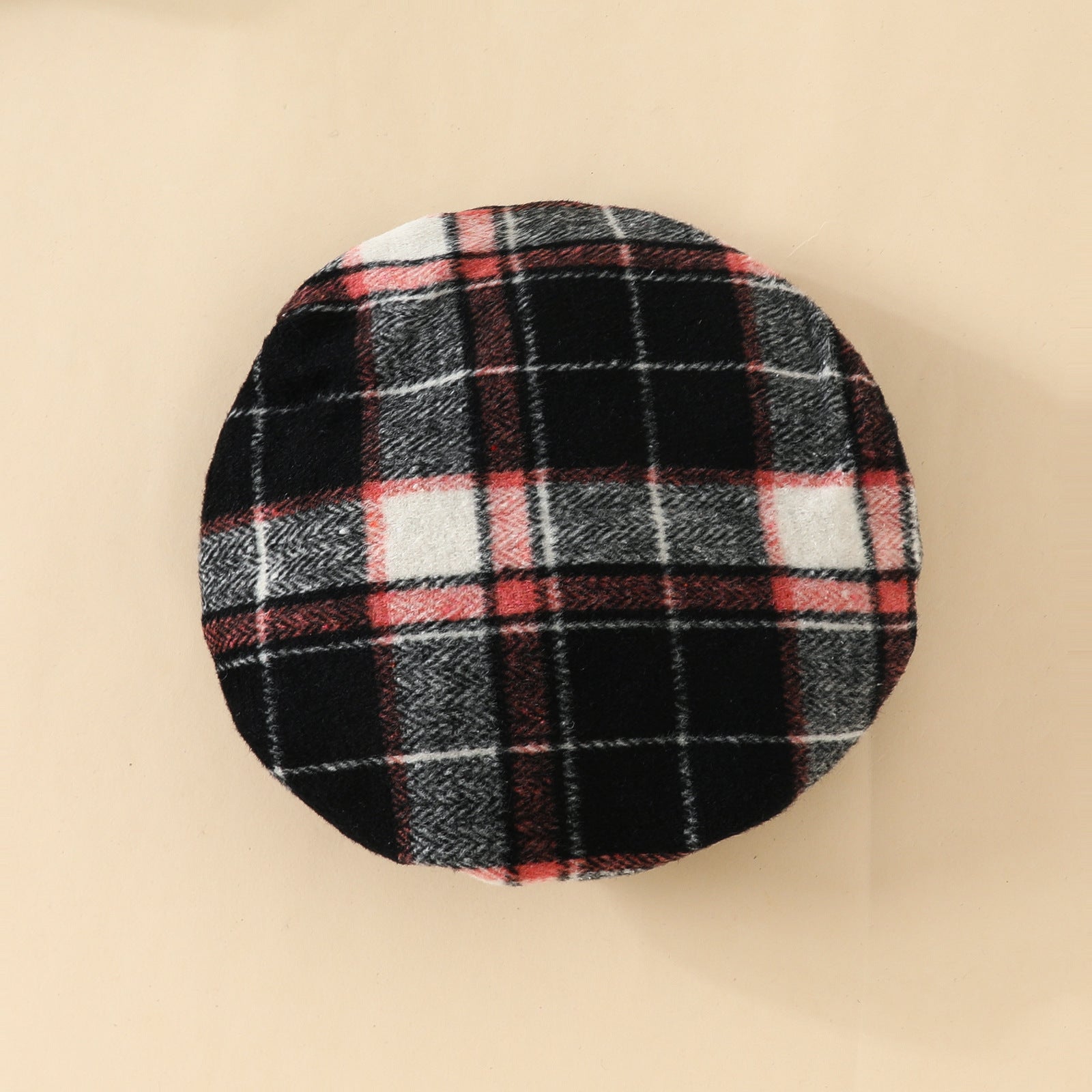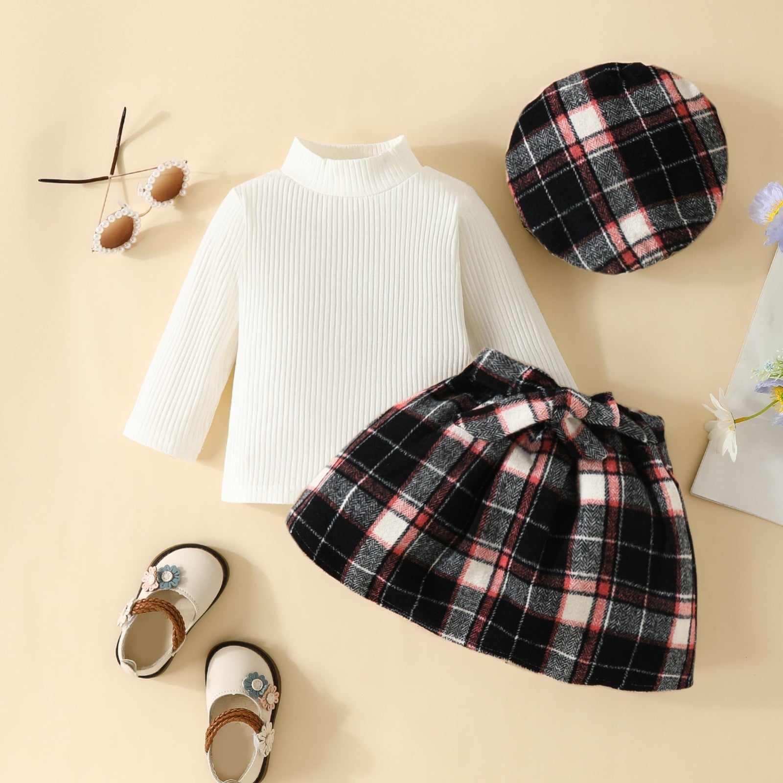 Turtleneck Top Drawstring Tartan Skirt Beret Three-piece Set