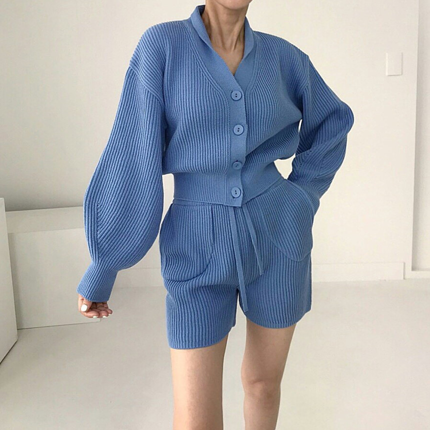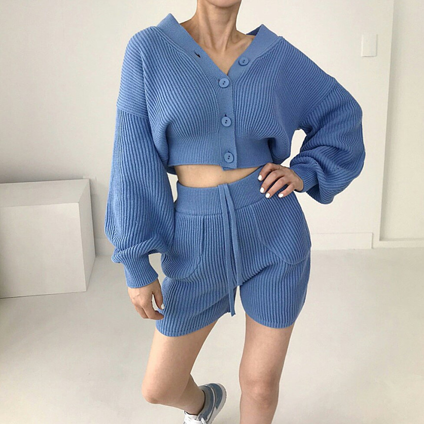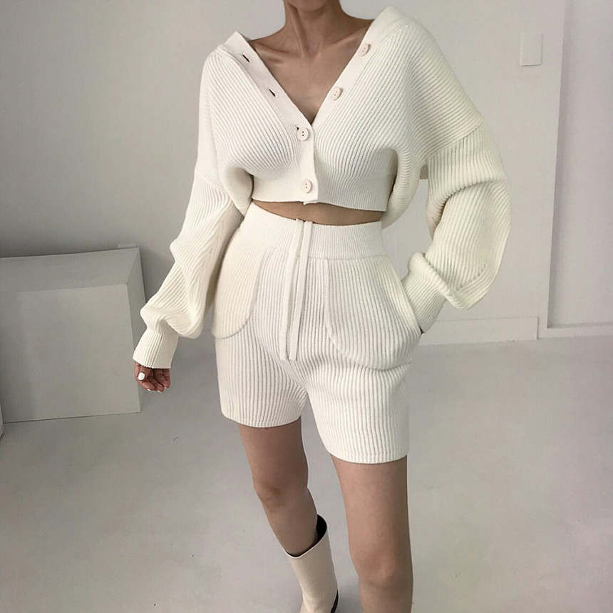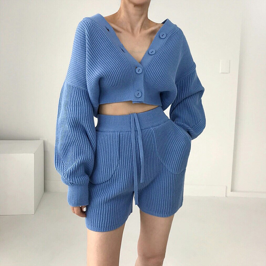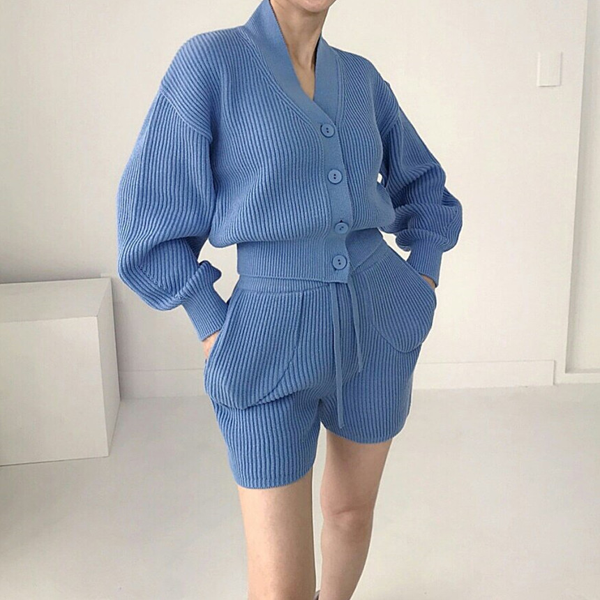 V-neck Knitted Cardigan High Waist Casual Shorts Suit