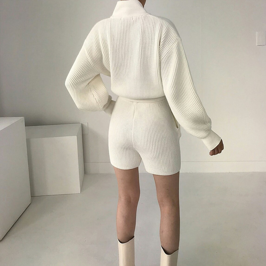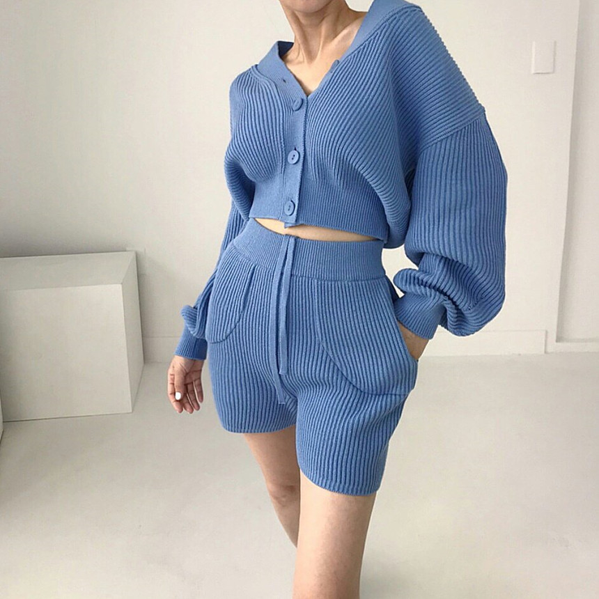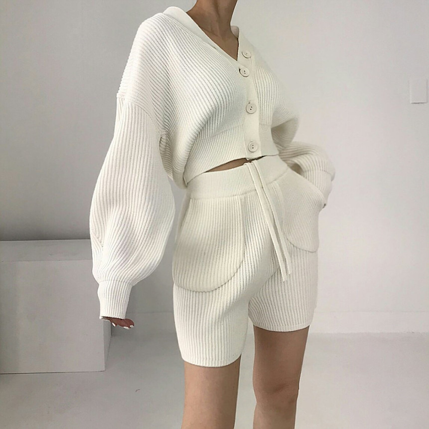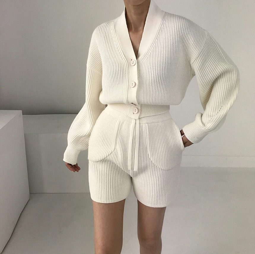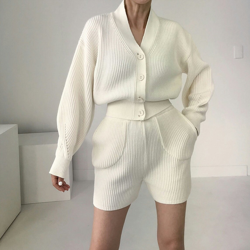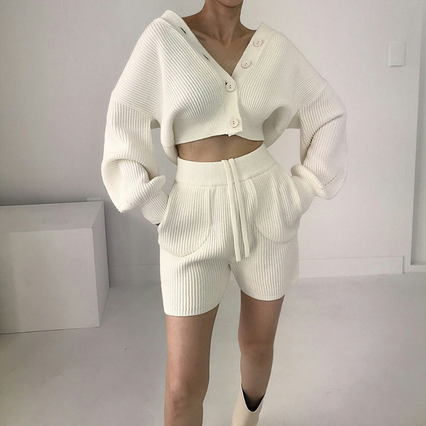 V-neck Knitted Cardigan High Waist Casual Shorts Suit