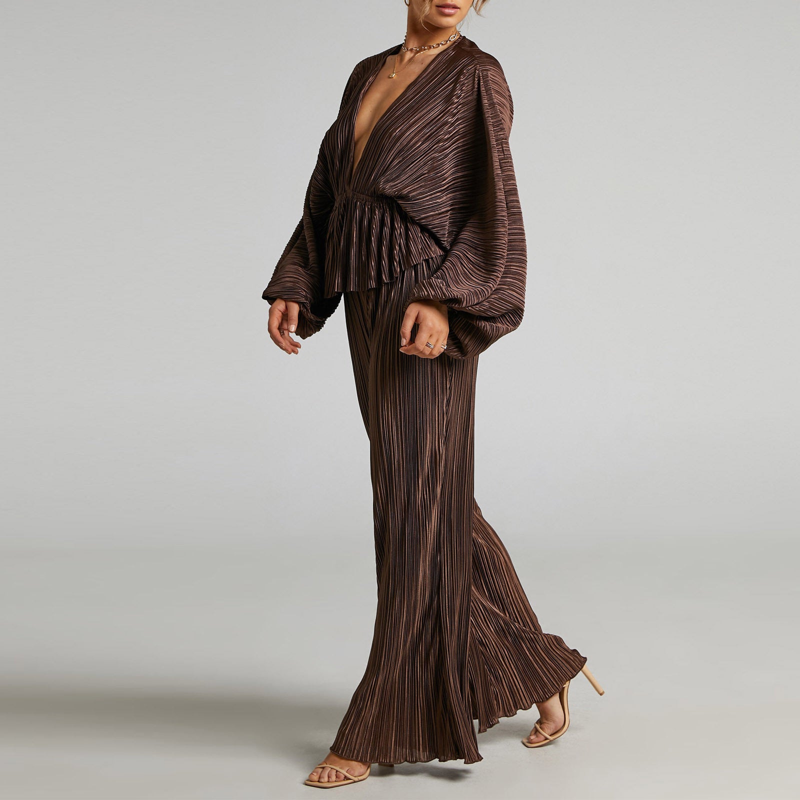 Women's New High Elastic Pleated Waist Deep V Casual Wide-leg Pants Two-piece Set