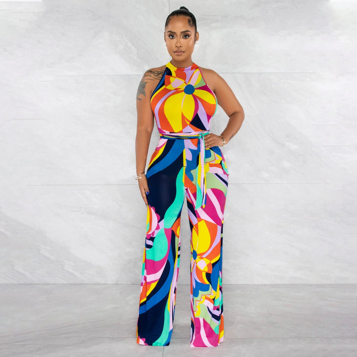 Women's Printed Sexy Sleeveless Lace-up Jumpsuit Trousers