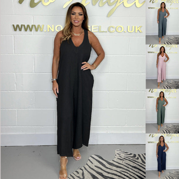 Women's Solid Color Cotton And Linen Suspender Wide Leg Pants