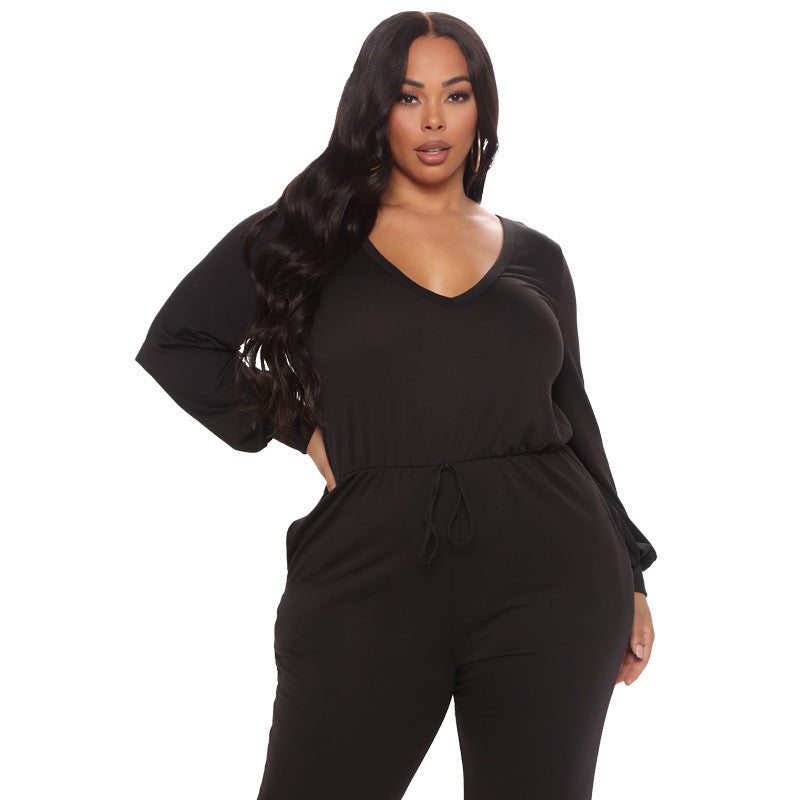 Women's V Neck Back Cutout Long Sleeve Casual Waist Jumpsuit