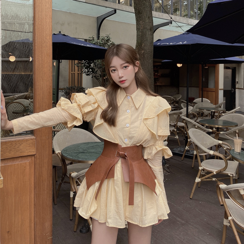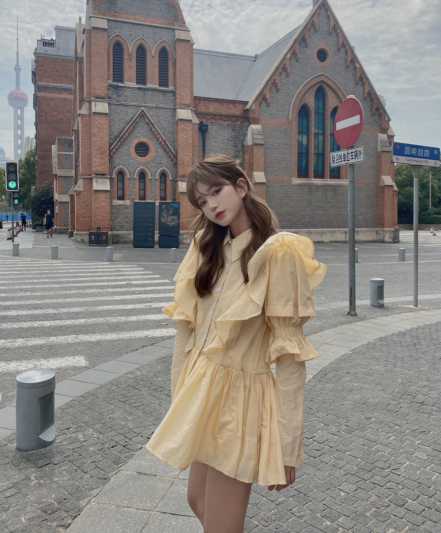 Yellow puff sleeve shirt waist dress